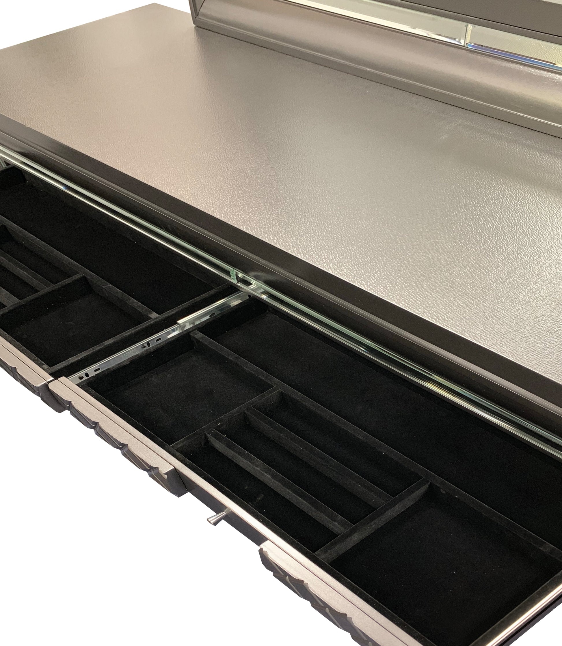 - This exquisite dresser combines both sophistication and functionality, featuring eight spacious drawers, including two dedicated jewelry drawers for the safe storage of precious items. The drawers are beautifully designed with sparkling trim and embossed fronts, adding a luxurious, textured look to the piece.