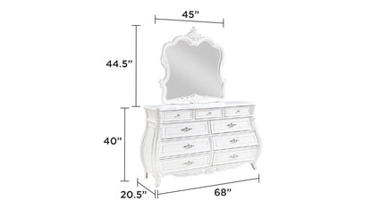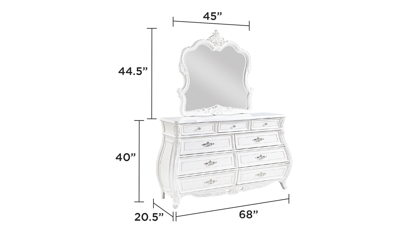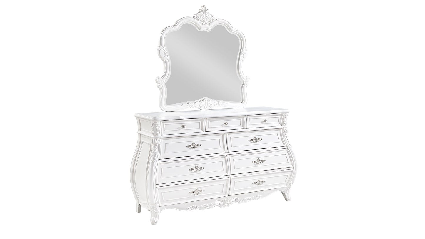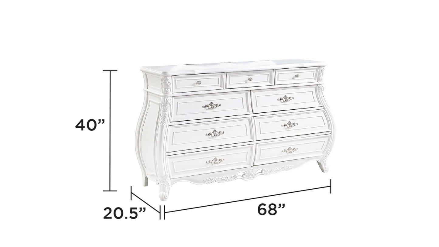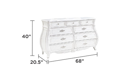 Bring timeless elegance to your bedroom with this exquisite dresser, crafted with intricate details and a smooth pearl finish. Its elegant curves and floral carvings on the drawers and sides give it a vintage, yet luxurious appeal. Offering ample storage, the dresser features multiple drawers, perfect for organizing your clothing and essentials. The combination of traditional craftsmanship and modern functionality makes this piece both stylish and practical, ideal for creating a refined bedroom environment.