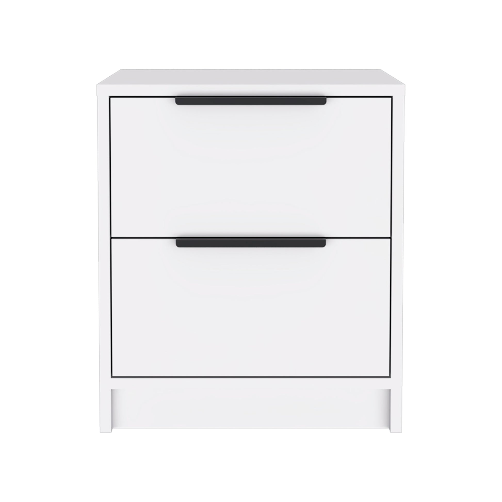 This contemporary two-drawer nightstand offers a clean, compact design that enhances your bedroom with style and ample storage. Featuring long, slender bar handles, it provides the extra space you need next to your bed.