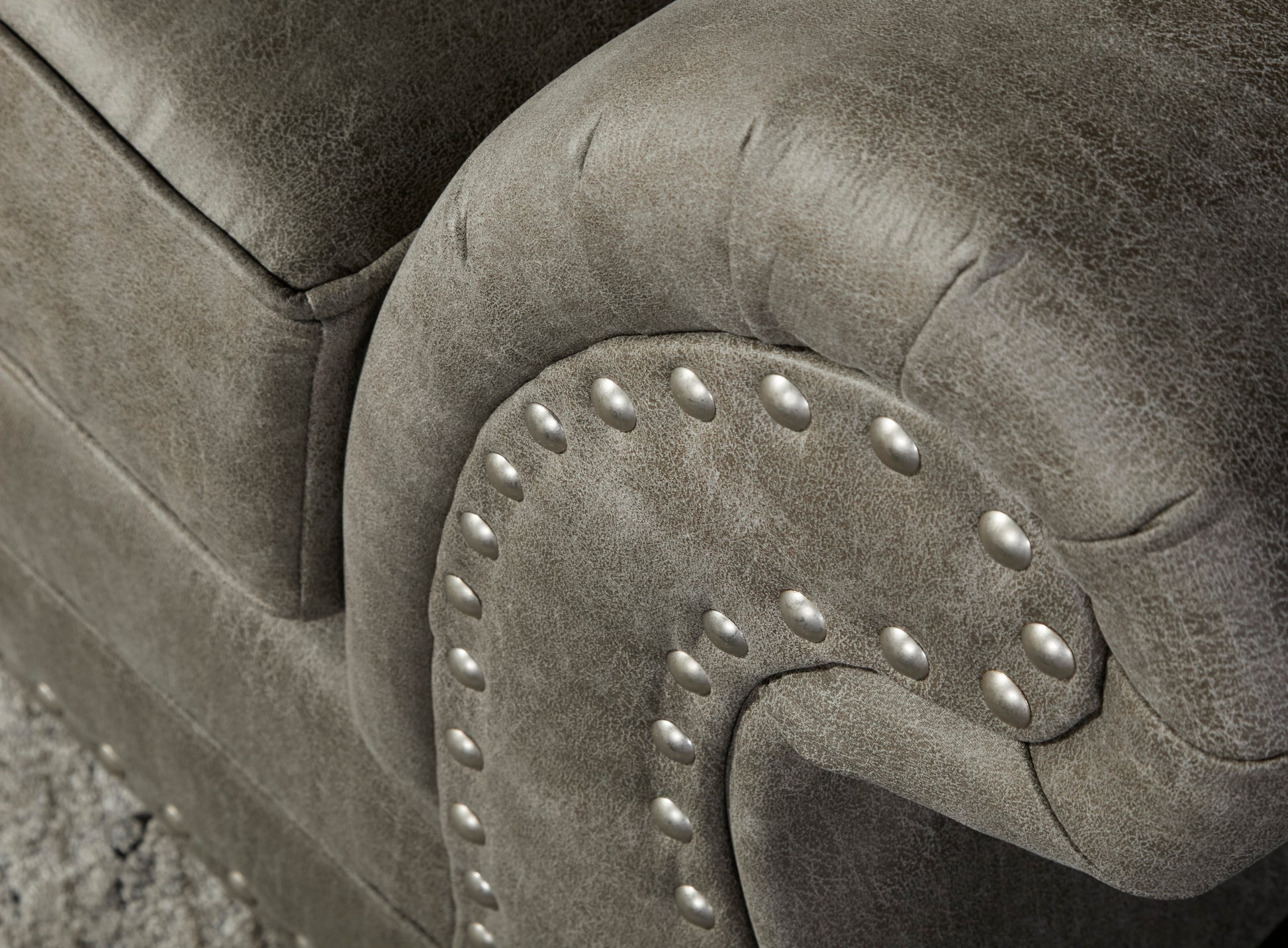 A classic silhouette and antiqued gray coloring make the Leinster Faux Leather Upholstered Nailhead Living Room Collection traditional with a casual twist. This collection is equipped with dramatic rolled arms, detailed welting, and striking nailhead trim. The soft faux leather upholstery comes in a stone gray that coordinates with any decor.