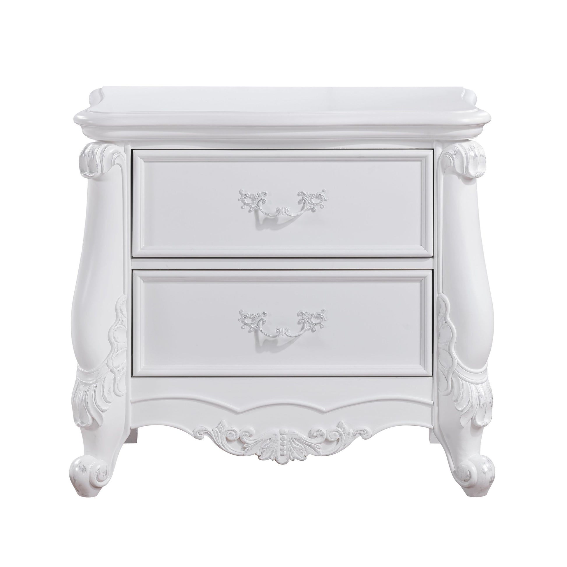 - This nightstand in a bright white finish offers a sleek and versatile addition to any bedroom décor.