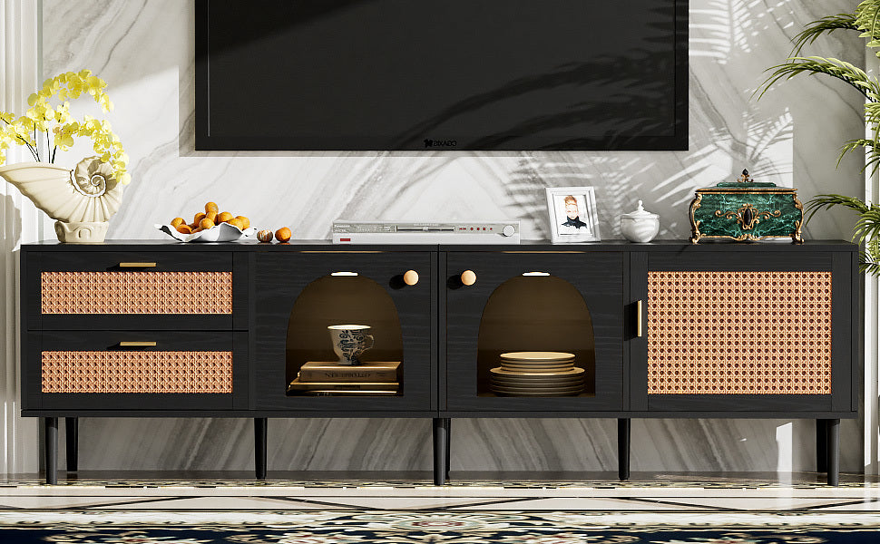 - [Rattan-inspired Design]Inspired by the rustic elegance of rattan furniture, this TV stand features a woven texture that adds a touch of sophistication to any room.