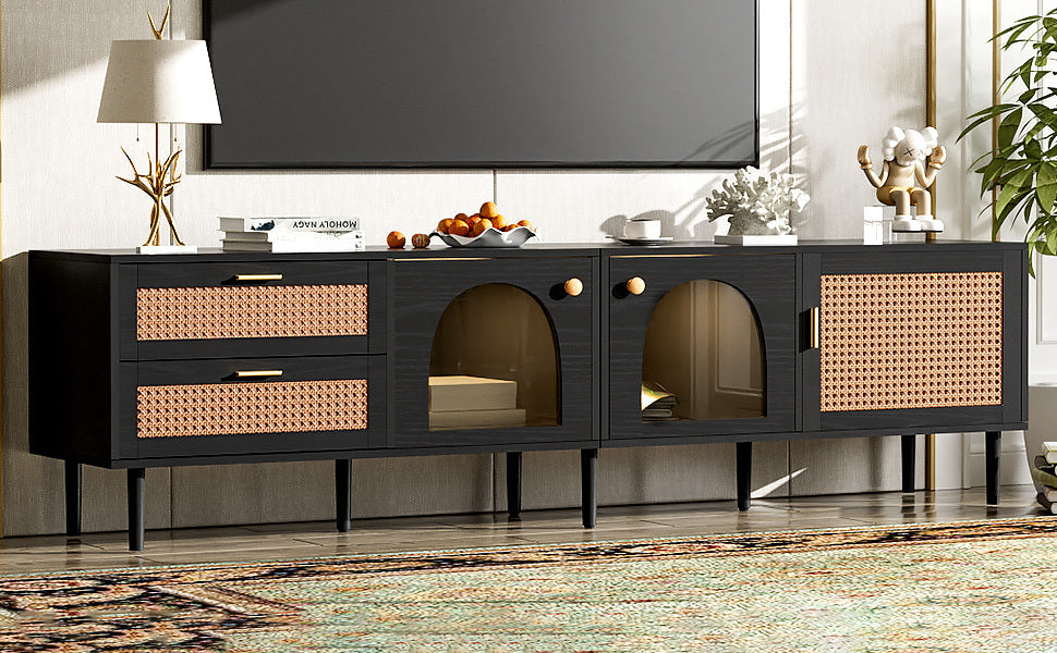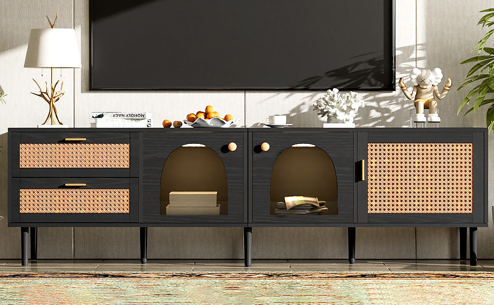 Rattan TV Stand with 3 Cabinets & 2 Drawers, Rattan-inspired Media Console Table for TVs up to 80'', LED Light Entertainment Center, TV cabinet for Living room, Bedroom, Home Theatre