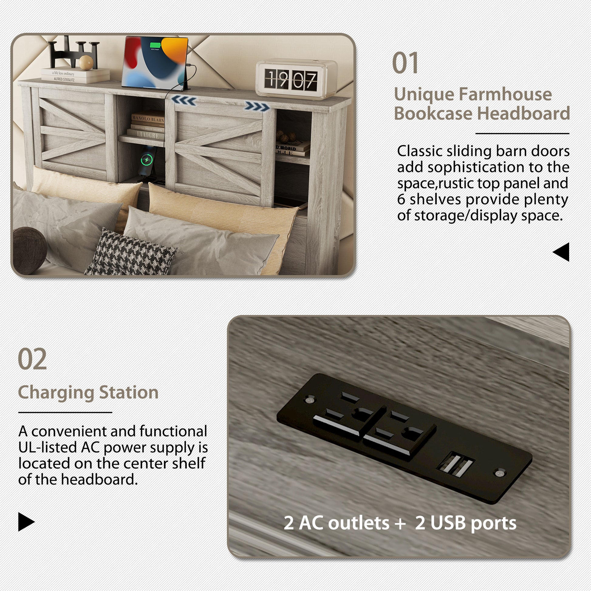 Farmhouse Platform Bed with Double Sliding Barn Door, Full Size Rustic Wood Bed with Charging Station, Wood Slats Support, Antique Gray