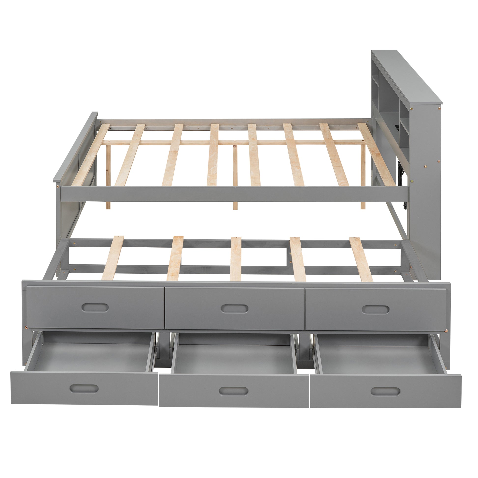 Full Size Platform Bed with Storage Headboard, USB, Twin Size Trundle and 3 Drawers, Gray