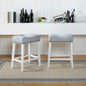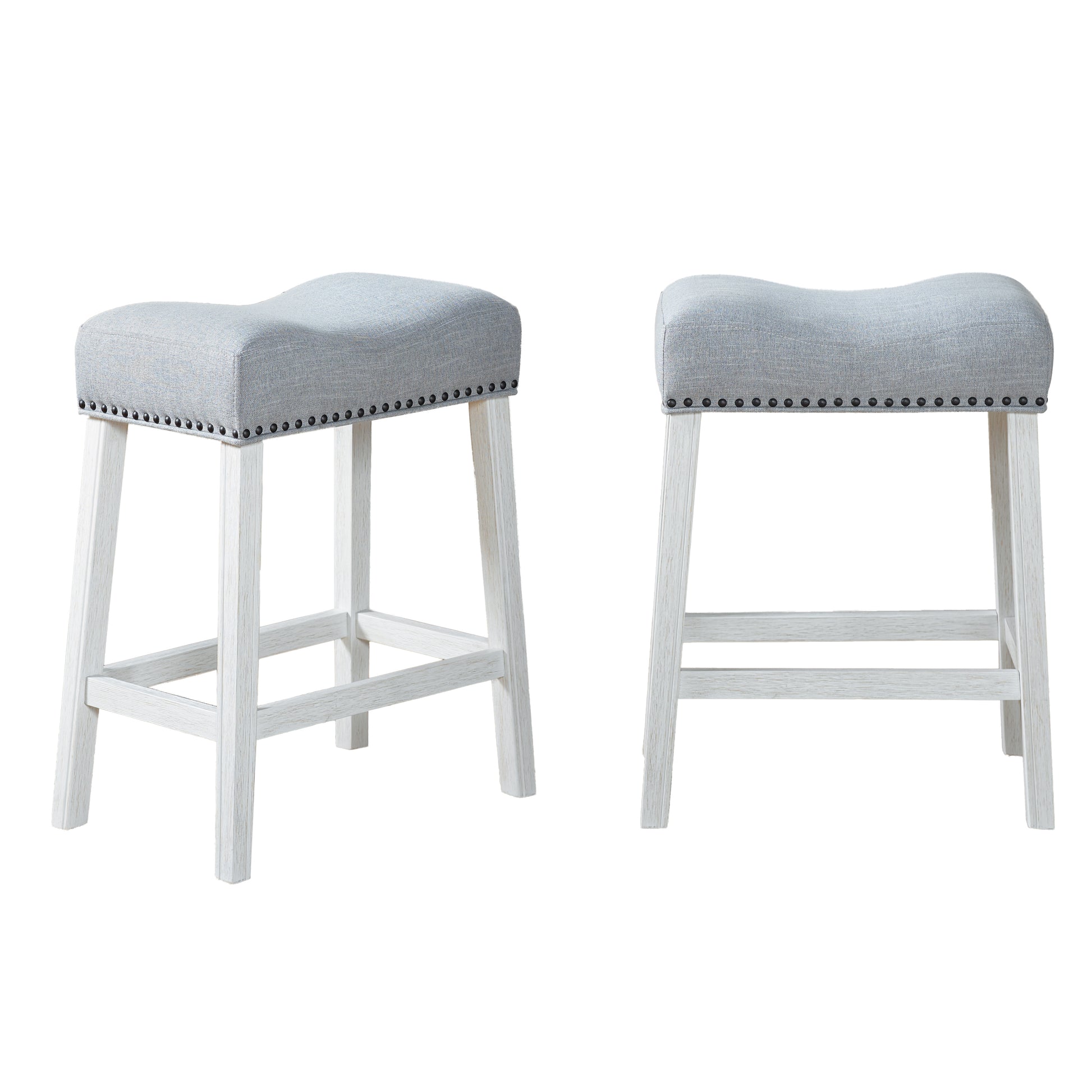 CoCo Upholstered Counter Height Stools - Saddle Seat, White-Washed Finish, Gray Fabric, Set of 2