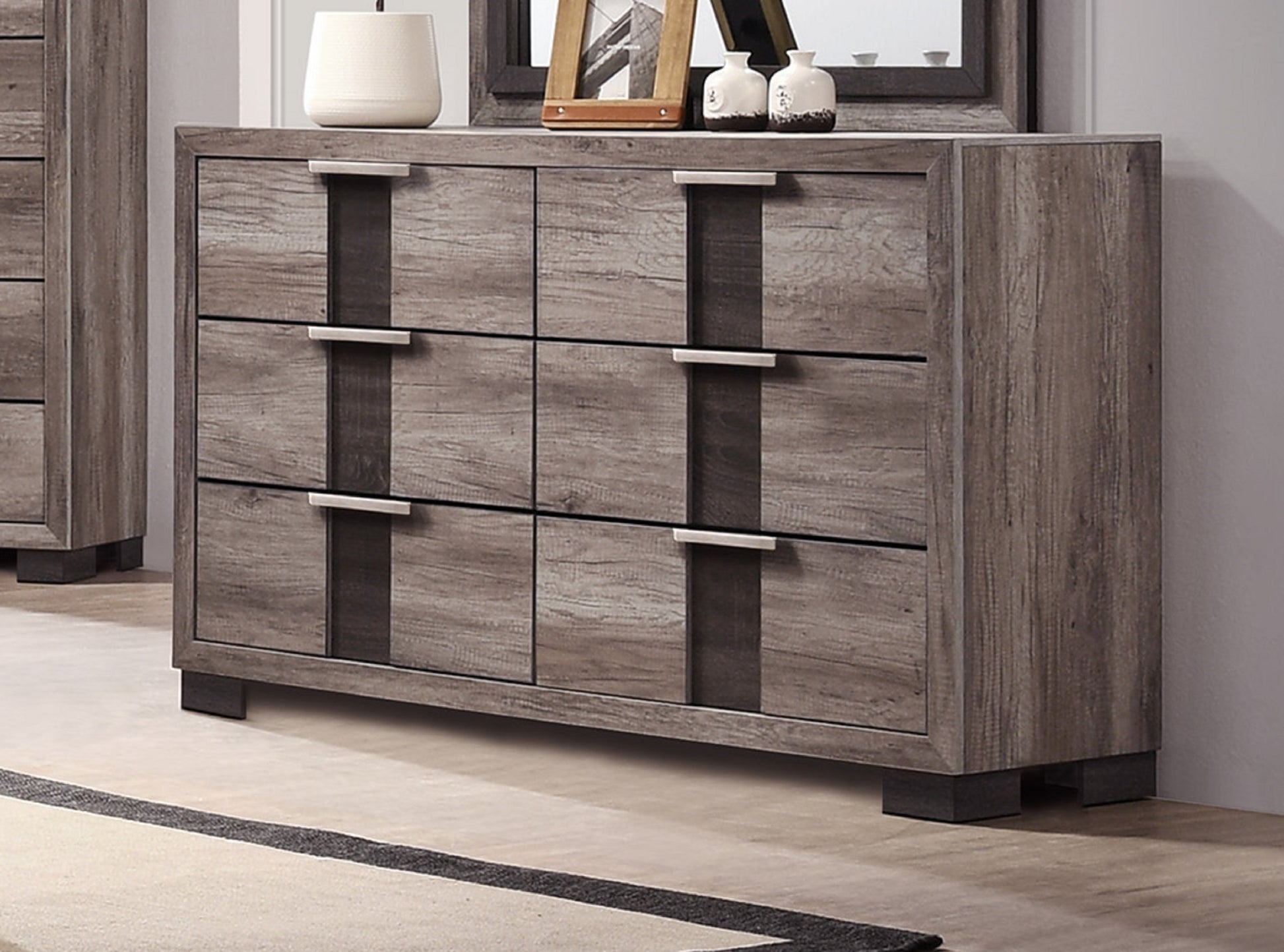 This sleek and modern 6-drawer dresser is an ideal storage solution for any bedroom. It features a stylish brown finish and elegant metal drawer pulls that add a touch of flair. The dresser is constructed from high-quality materials and is built to last. With six spacious drawers, you'll have ample storage space for all your clothing and accessories. The clean lines and contemporary design of this dresser make it a stylish addition to any bedroom decor. Whether you're looking to update your current bedroom or furnish a new one, this 6-drawer dresser is sure to impress.