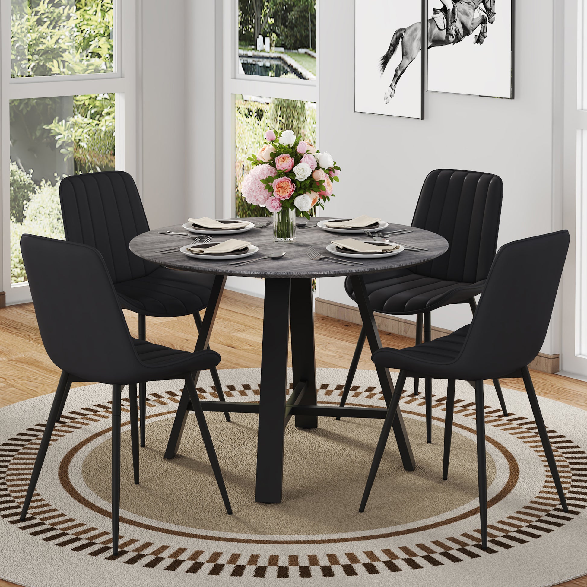 Table and chair set.Modern minimalist 42 'diameter Round MDF Dining Table Set - 4 Extended Seat Cushion PU Dining Chair Set.Gray Wood Grain MDF Table Top,Black Cushion.