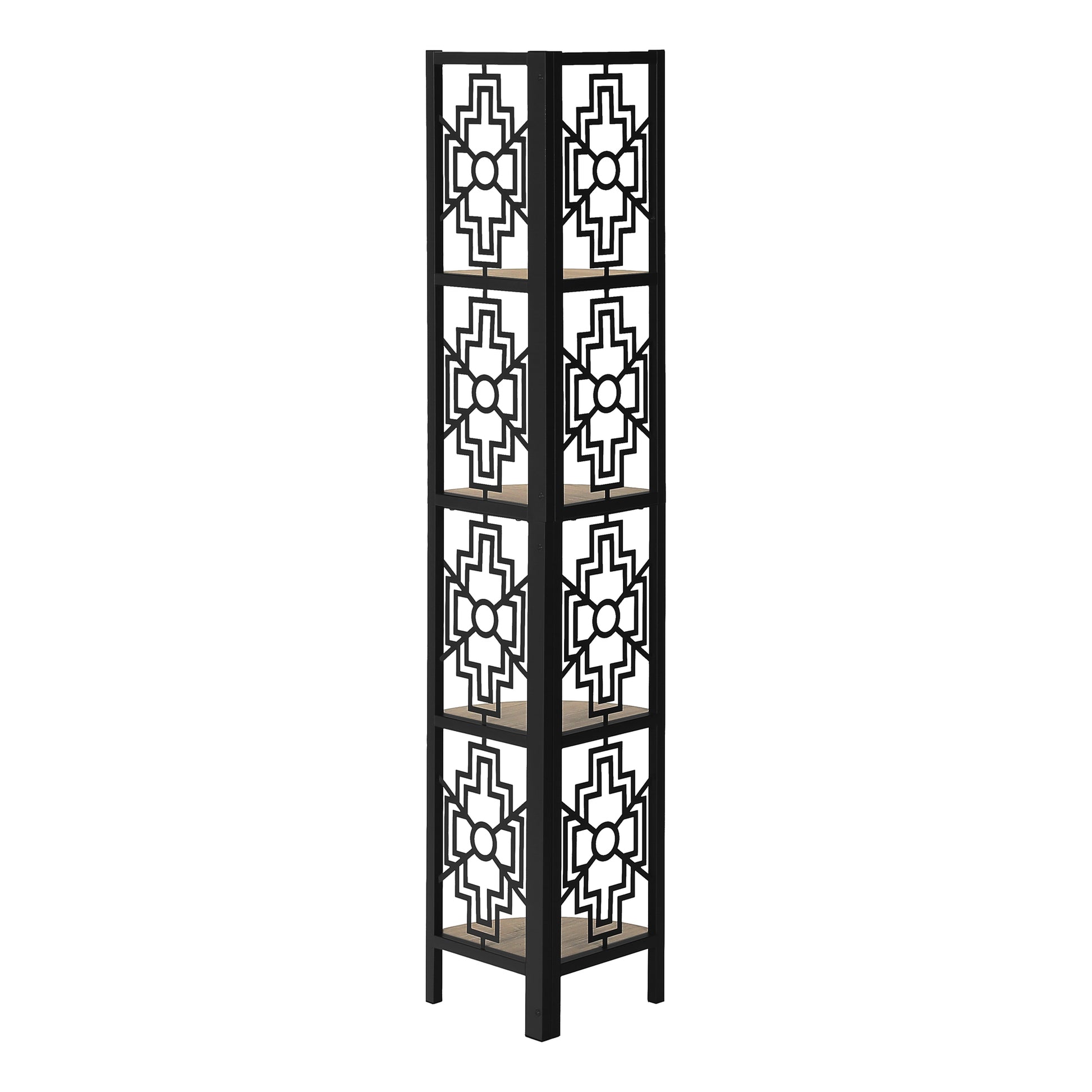 - 4 tier metal etagere bookcase with evenly spaced taupe wooden shelves