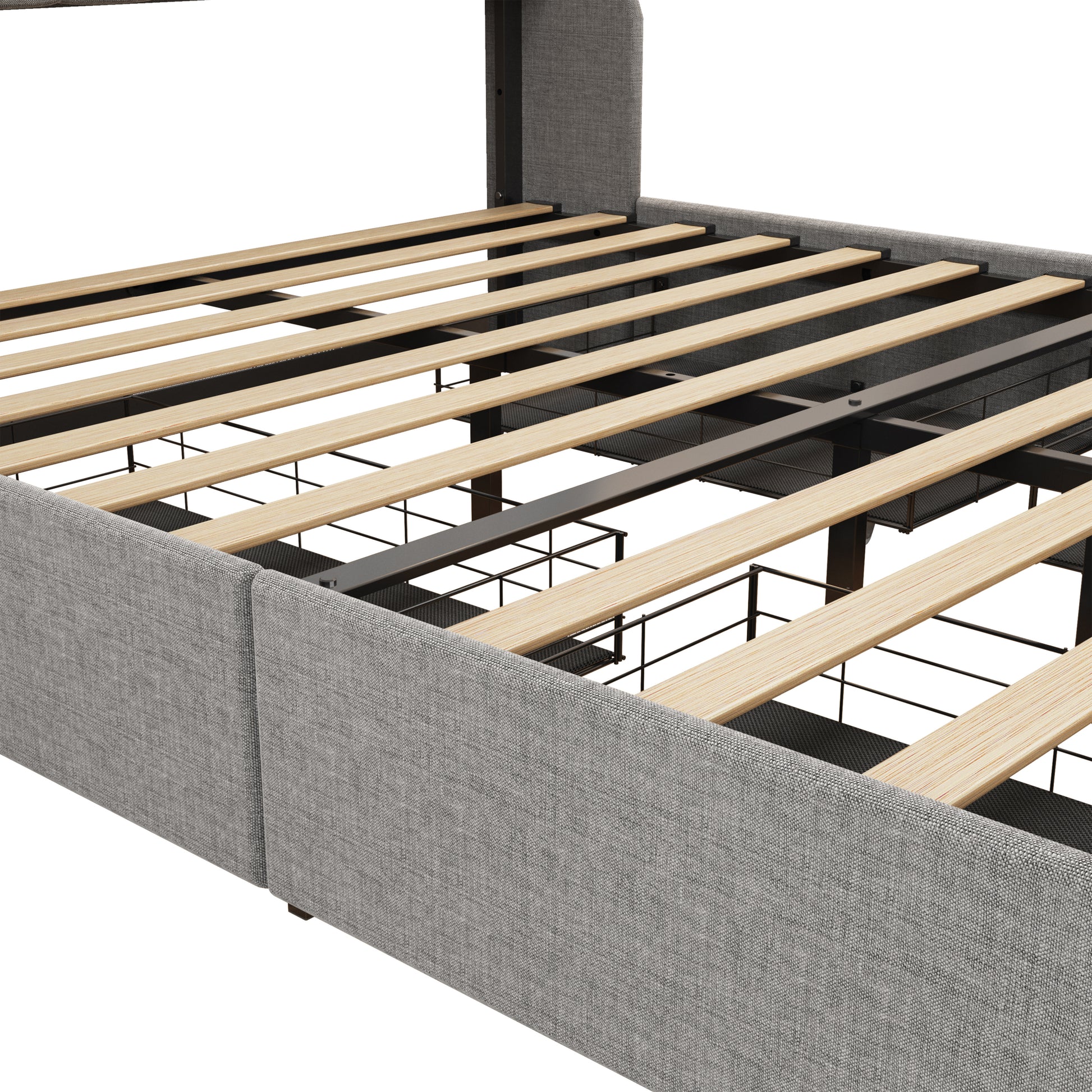 Full Size Bed Frame with LED, 4 Under-bed Portable Storage Drawers, Wings Headboard Design, Light Grey