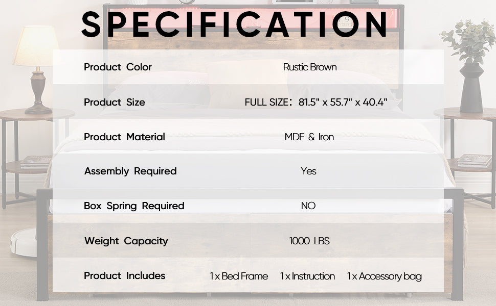 - Smart RGB Led Bed Frame Full: This Led bed frame features with Led-lit headboard for ambient mood lighting and the combination of rustic-wood and metal accents for industrial appearance. More than 60,000 color to be choose from, brightness, flash mode, timing, etc., can use the equipped remote control or mobile APP to set free easily. Change the led color to meet your needs of different styles and make the atmosphere more vivid! Also make your home life more colorful.