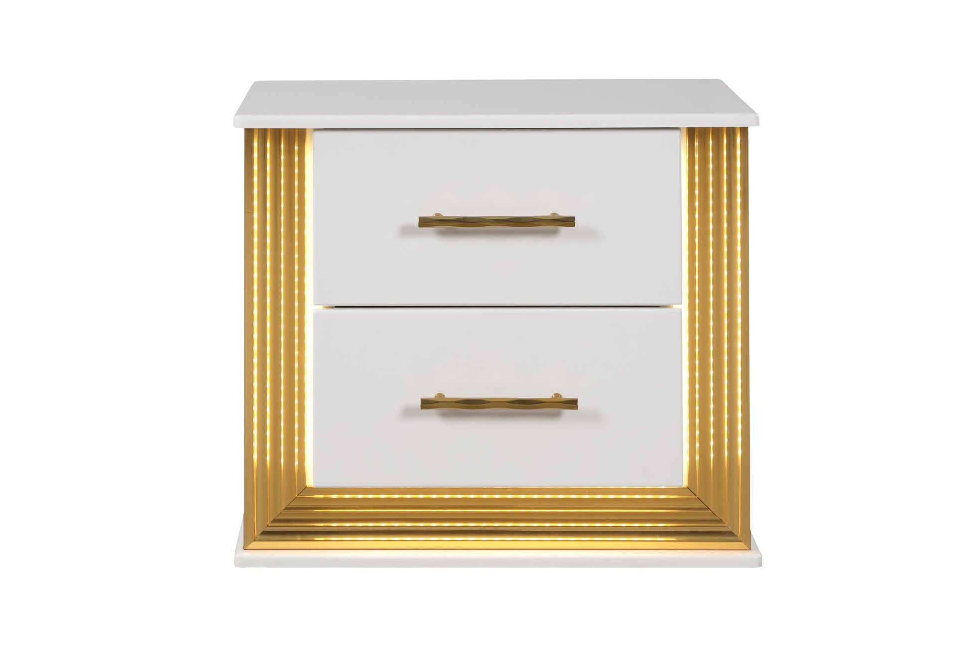 Introduce the perfect bedside companion to your modern bedroom with this contemporary nightstand, seamlessly blending functionality and aesthetics. Boasting two drawers and LED lights, this nightstand provides both storage and a touch of elegance. Crafted from solid and manufactured wood in a dazzling gold finish, it stands as a dazzling addition to your bedroom decor. The contemporary design enhances your bedroom's appeal, making this nightstand not only a practical storage solution but also a stylish statement piece that elevates your bedside space.