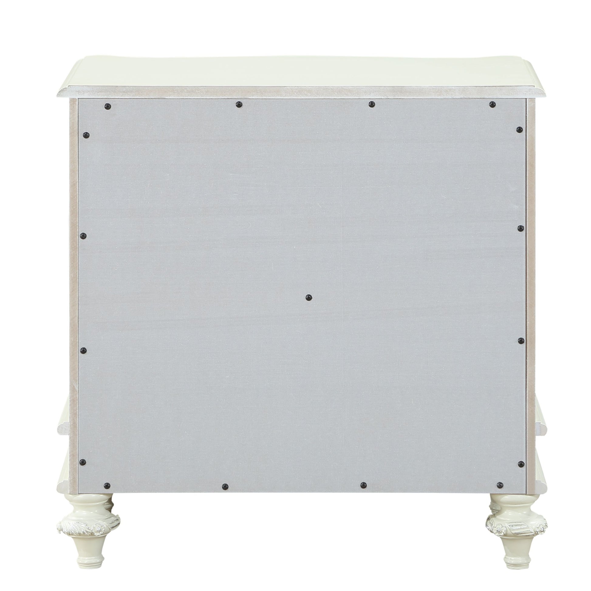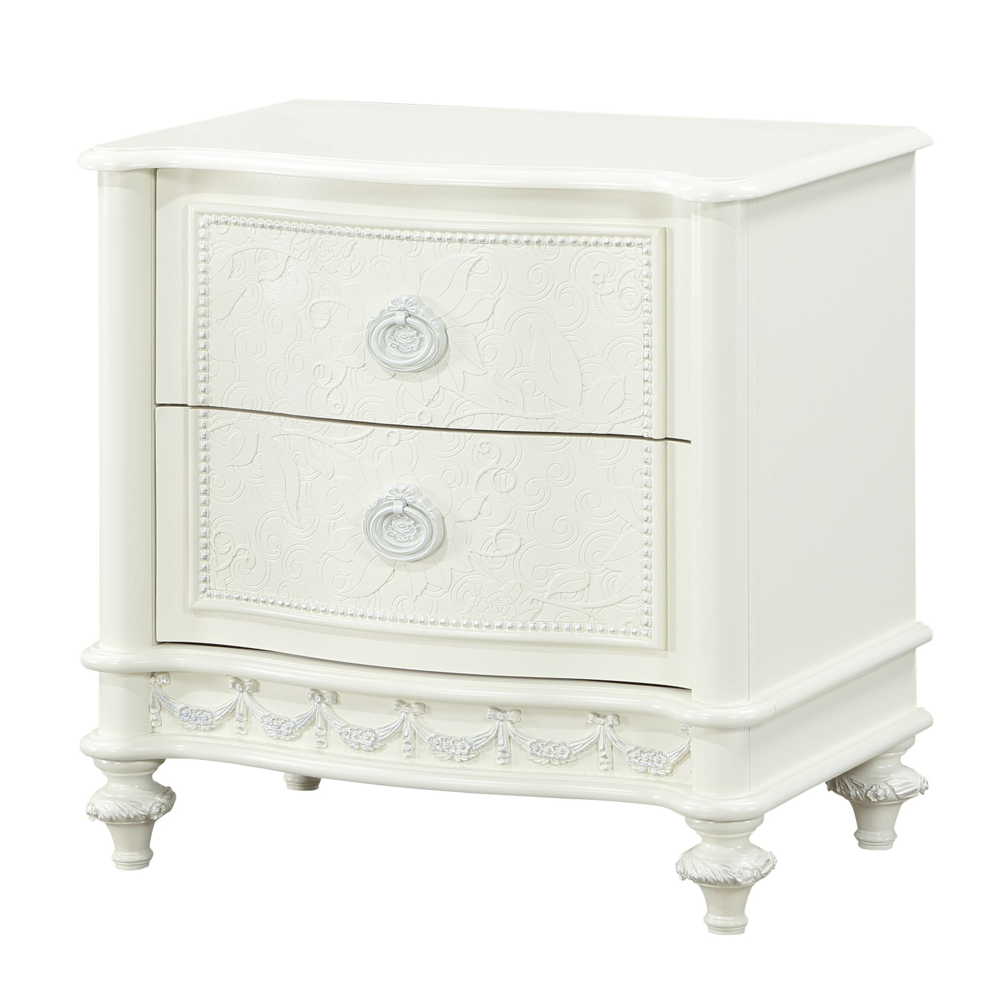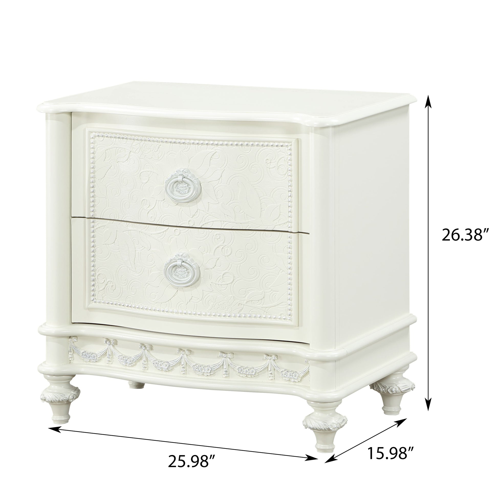 Enhance your bedroom decor with this charming nightstand, featuring two drawers adorned with stylish ring pull handles and intricate floral details, ensuring both functionality and elegance. Each drawer smoothly slides out on durable metal glides, extending three-quarters of the way for easy access and seamless functionality.