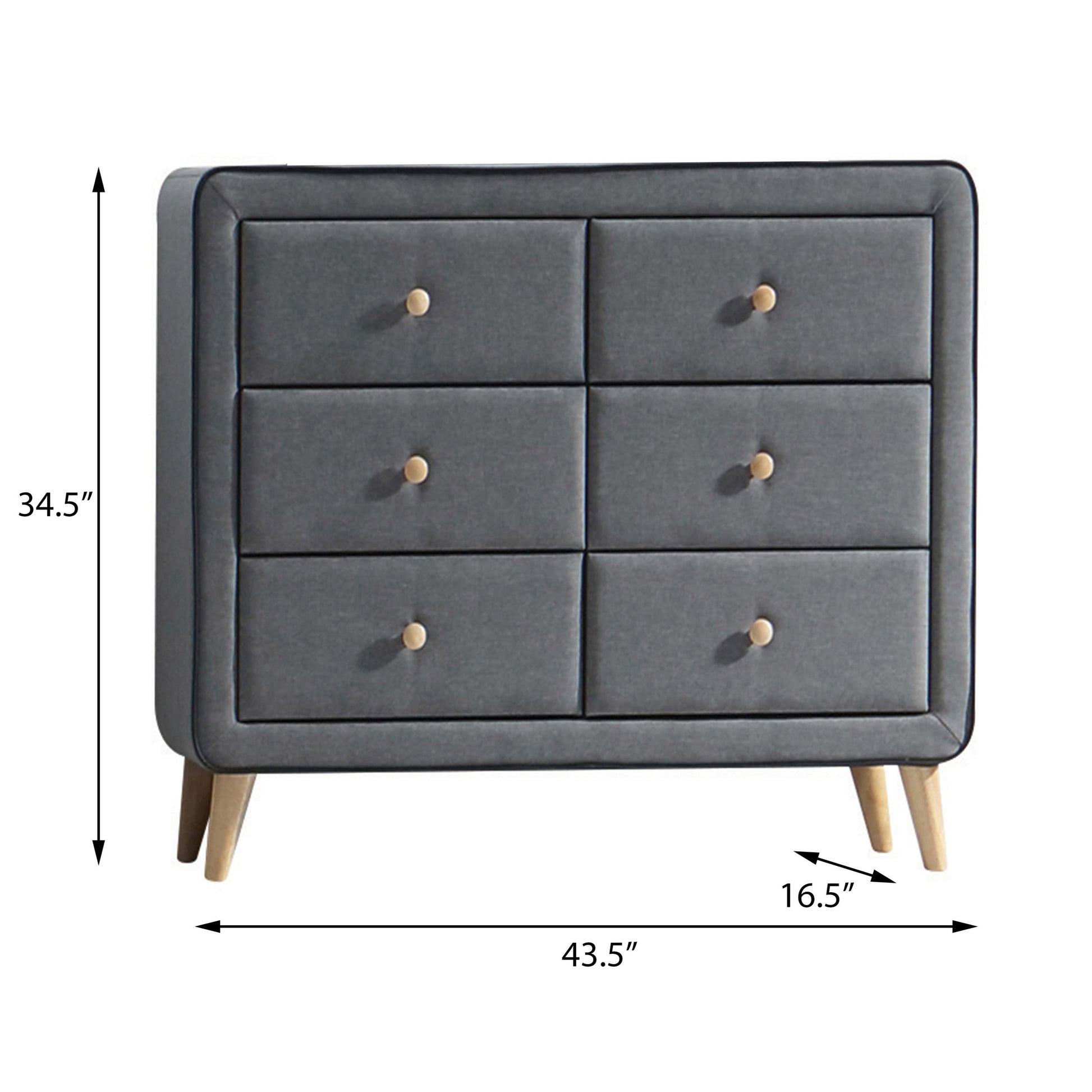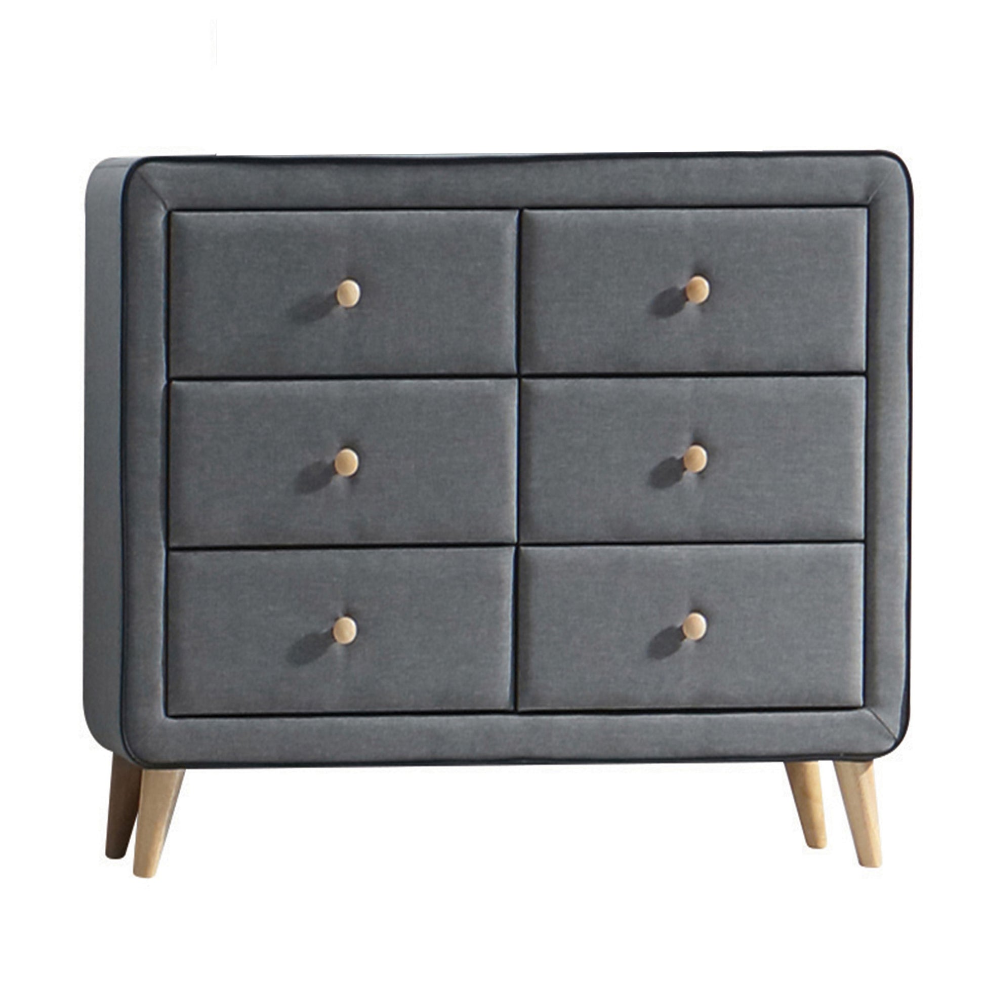 Add a touch of mid-century style to your bedroom with this upholstered double dresser, boasting light grey fabric covering the front and sides of the drawers for added texture and contrast. With six spacious drawers, it offers ample storage for clothes, accessories, and other essentials, while wooden tapered legs with a natural finish provide stability and support.
