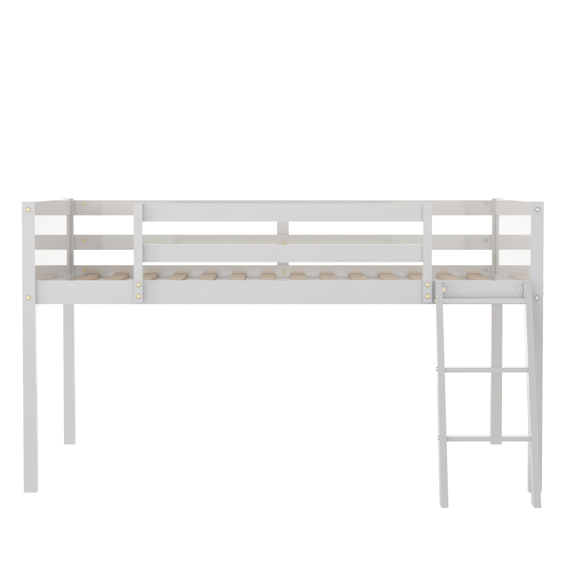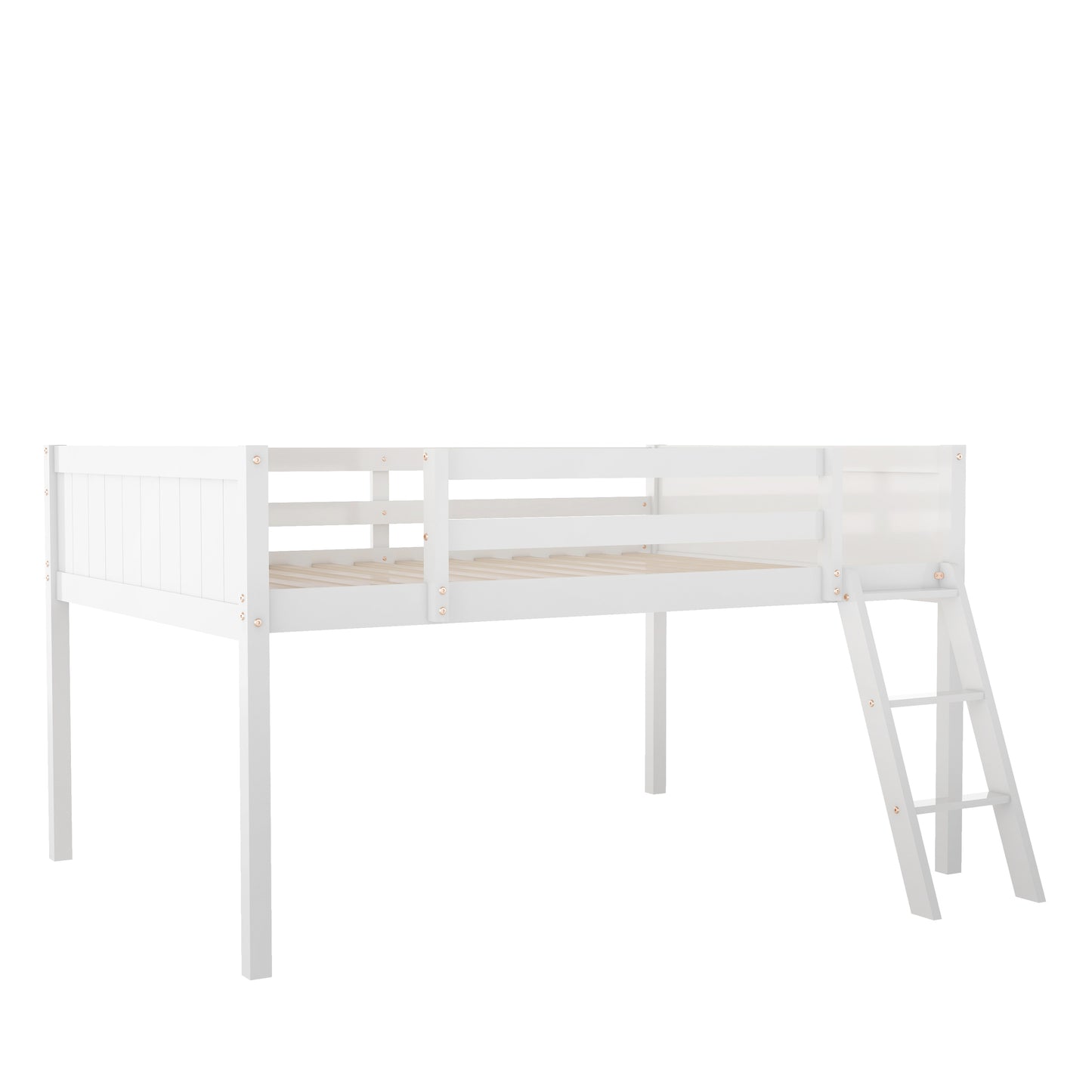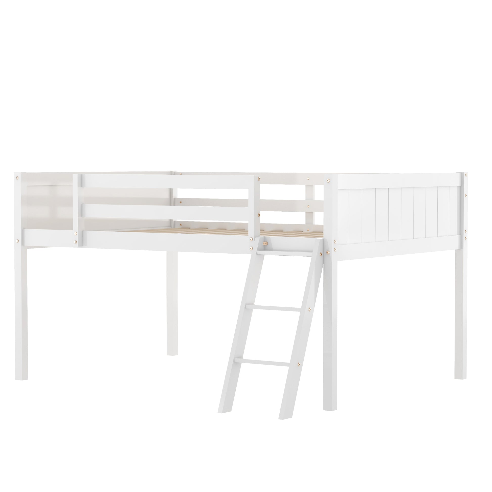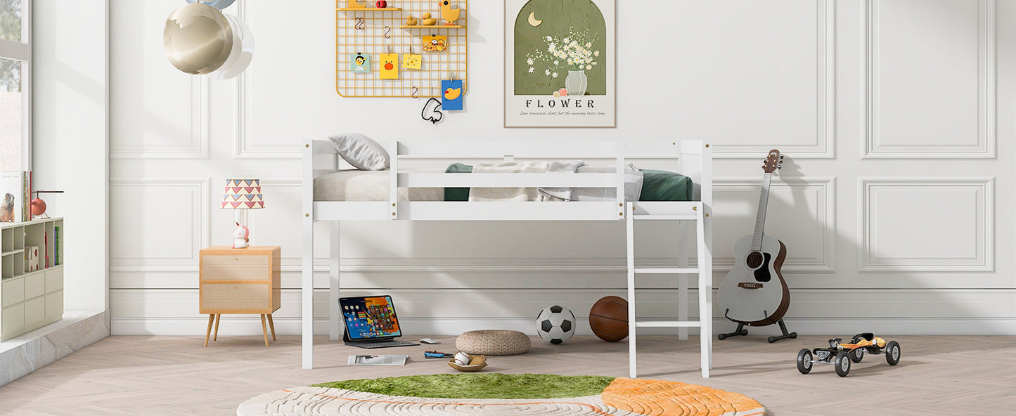 Full Size Wood Low Loft Bed with Ladder, ladder can be placed on the left or right, White