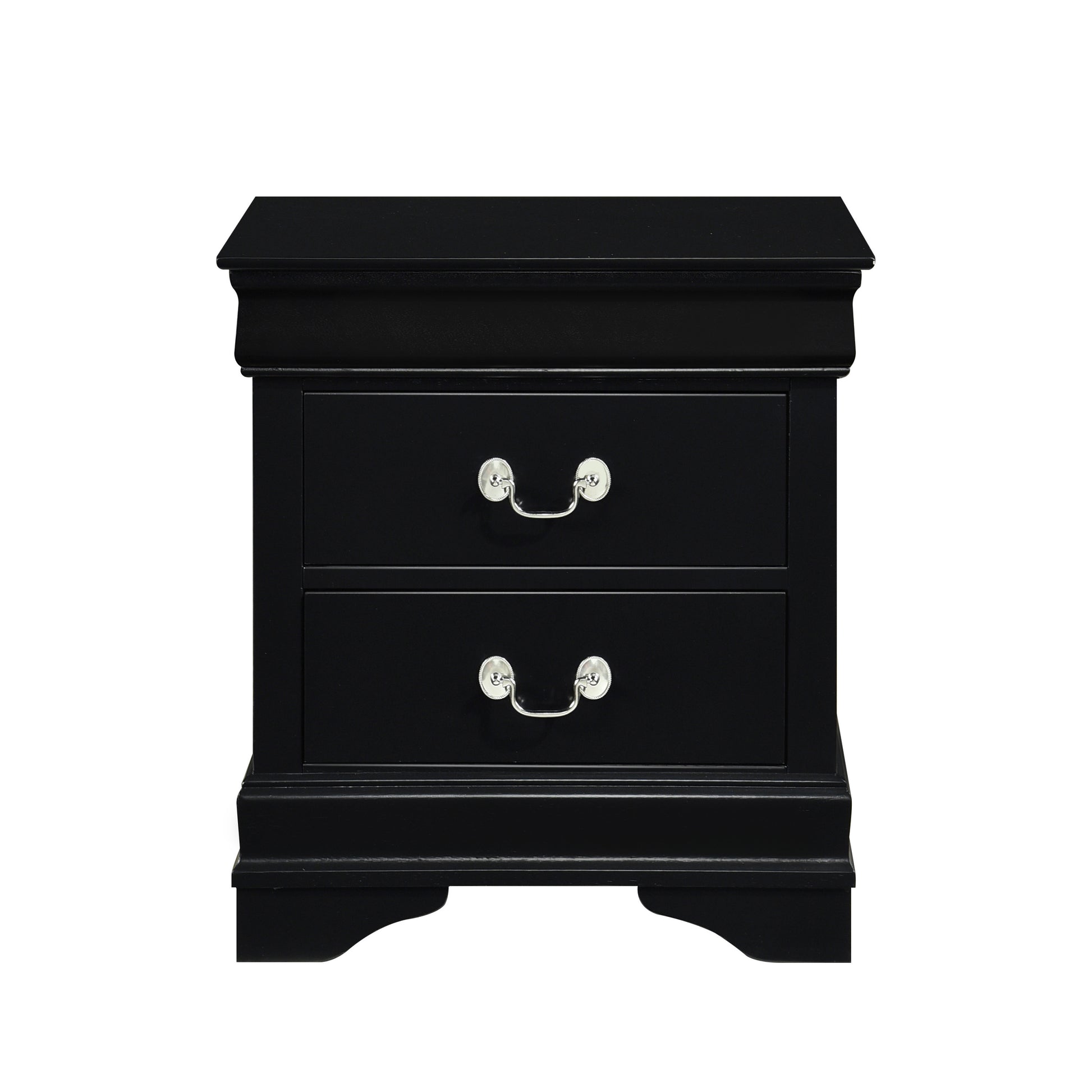 Traditional in design and modest in scale, this elegant Collection takes its design inspiration from the classic Louis Philippe styling. The Okume veneer of the nightstand is paired with a black finish and is accentuated by antique nickel tone drop handles.