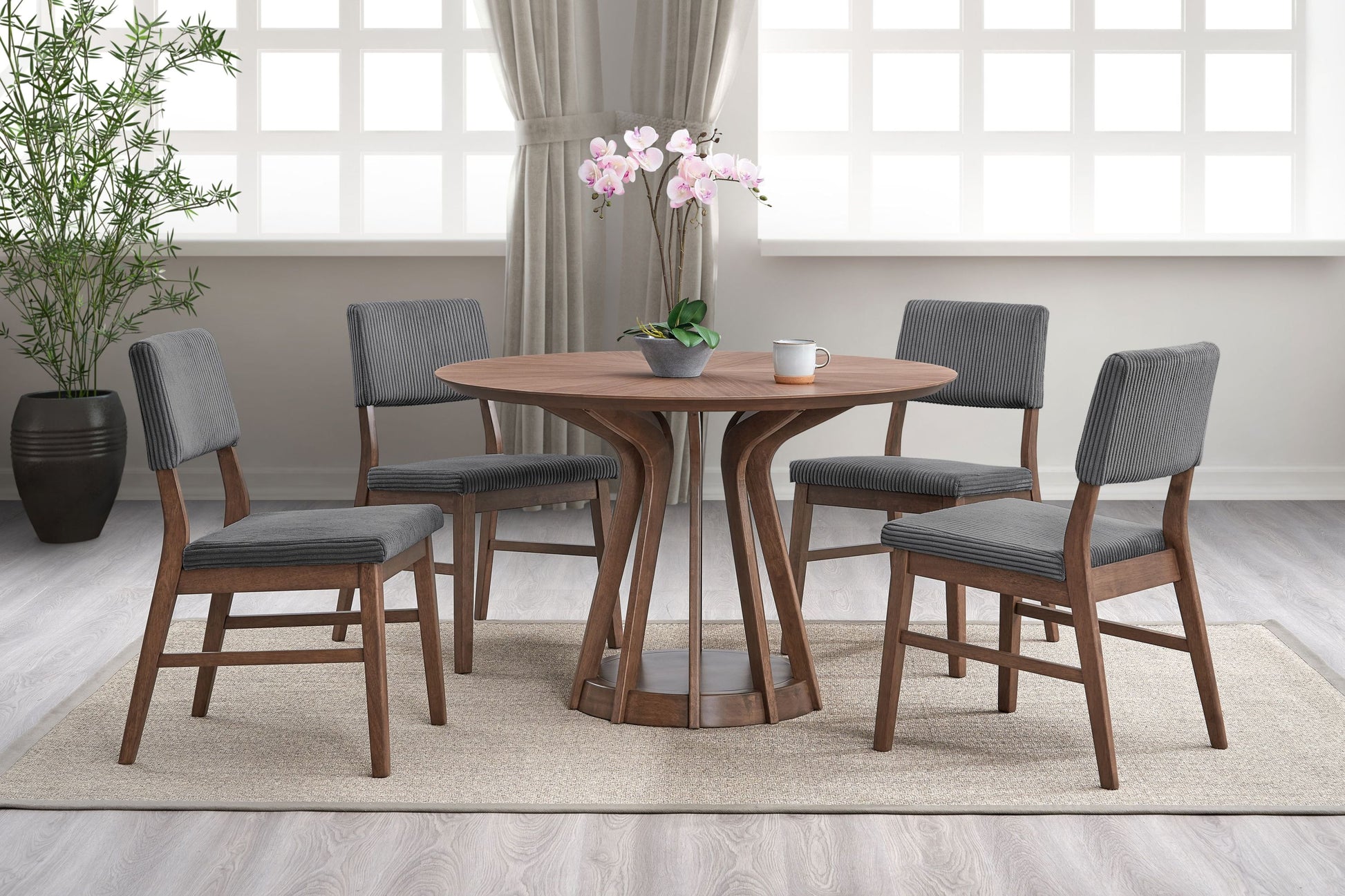 Seda 5Pcs Walnut Finish Round Table w/Gray Corduroy Chair Dining Set
