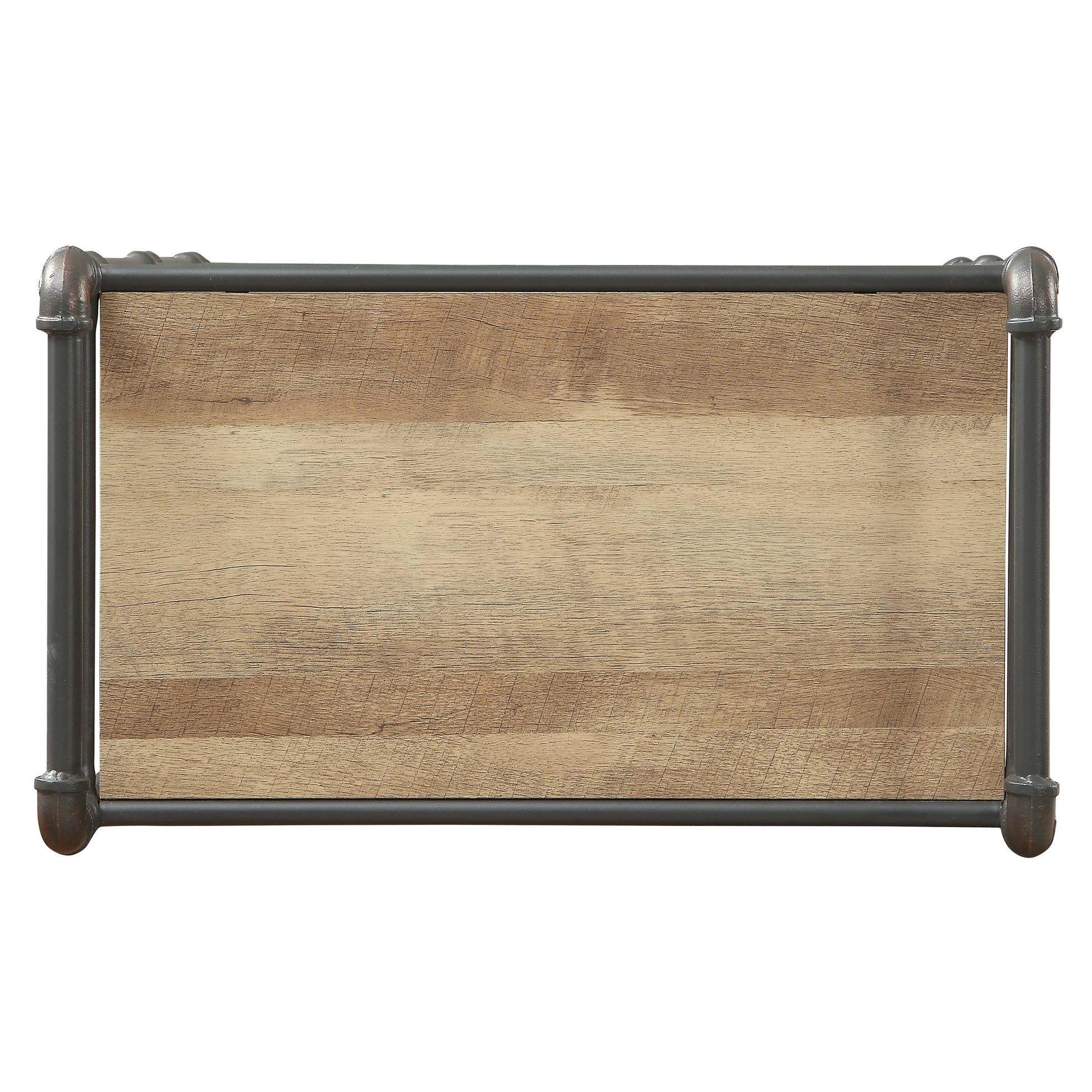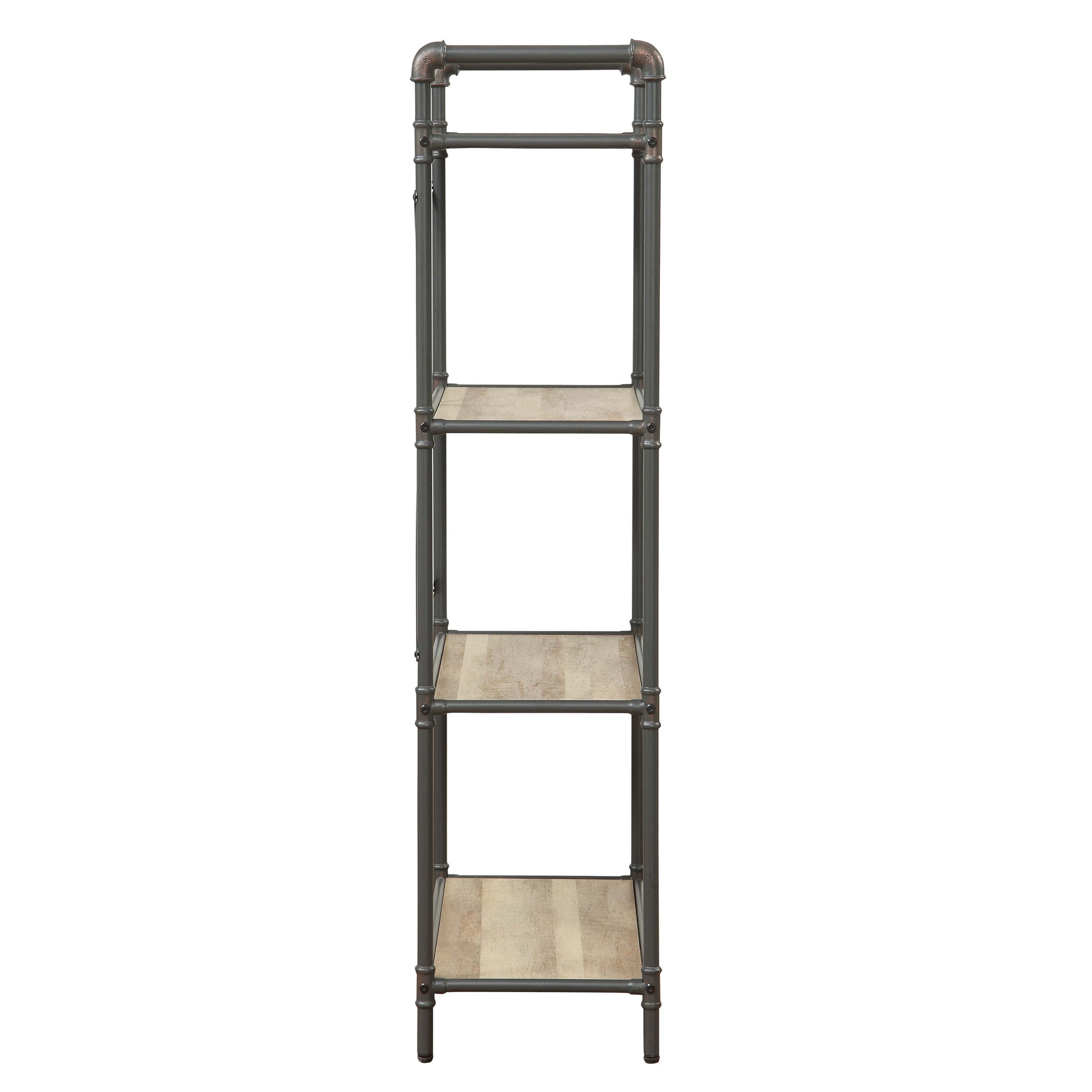 - Industrial-style bookshelf featuring an antique oak and sandy grey finish for a vintage look