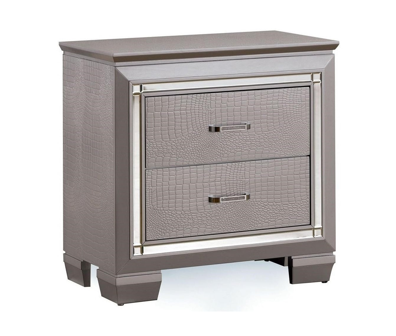 Specifically designed to accentuate a glamorous feel, this bedroom collection brings a combination of class and contemporary style to your bedroom. Crocodile embossed veneer and silver lining panels stand out throughout every piece while, the bottom of this night stand has built-in LED lights to illuminate the mood.