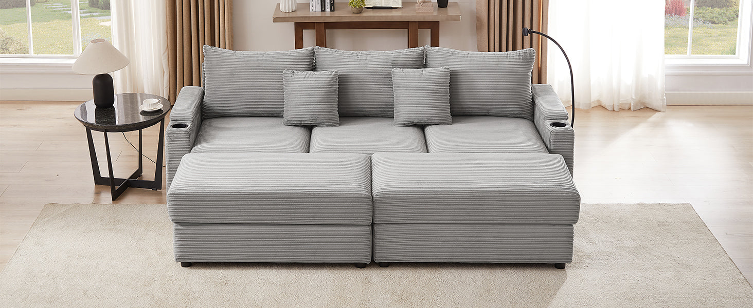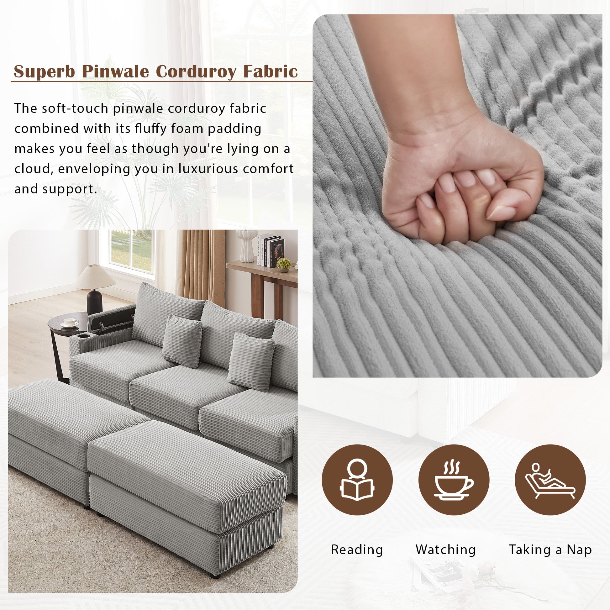 95.3" Modern Style 3-Seater Sofa Sectional Sofa Couch with Storage Space, Two Movable Ottomans, Two USB Ports, Two Cup Holders, A Phone Holder for Living Room, Grey