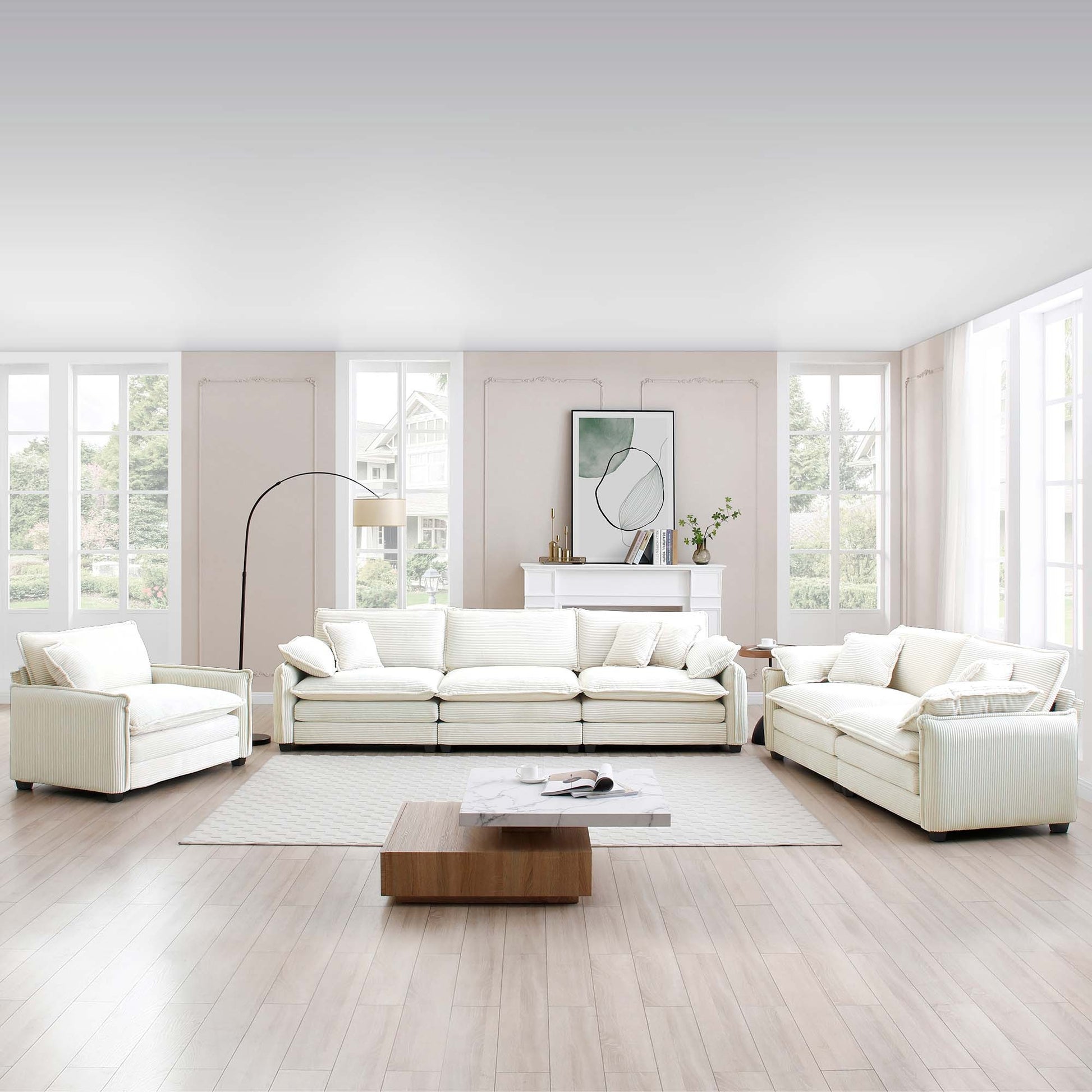3 Piece Comfortable Oversized Sectional Sofa, One Single Sofa and One 2-Seater Sofa and One 3-Seater Sofa , Beige Corduroy Deep Seat Sofa