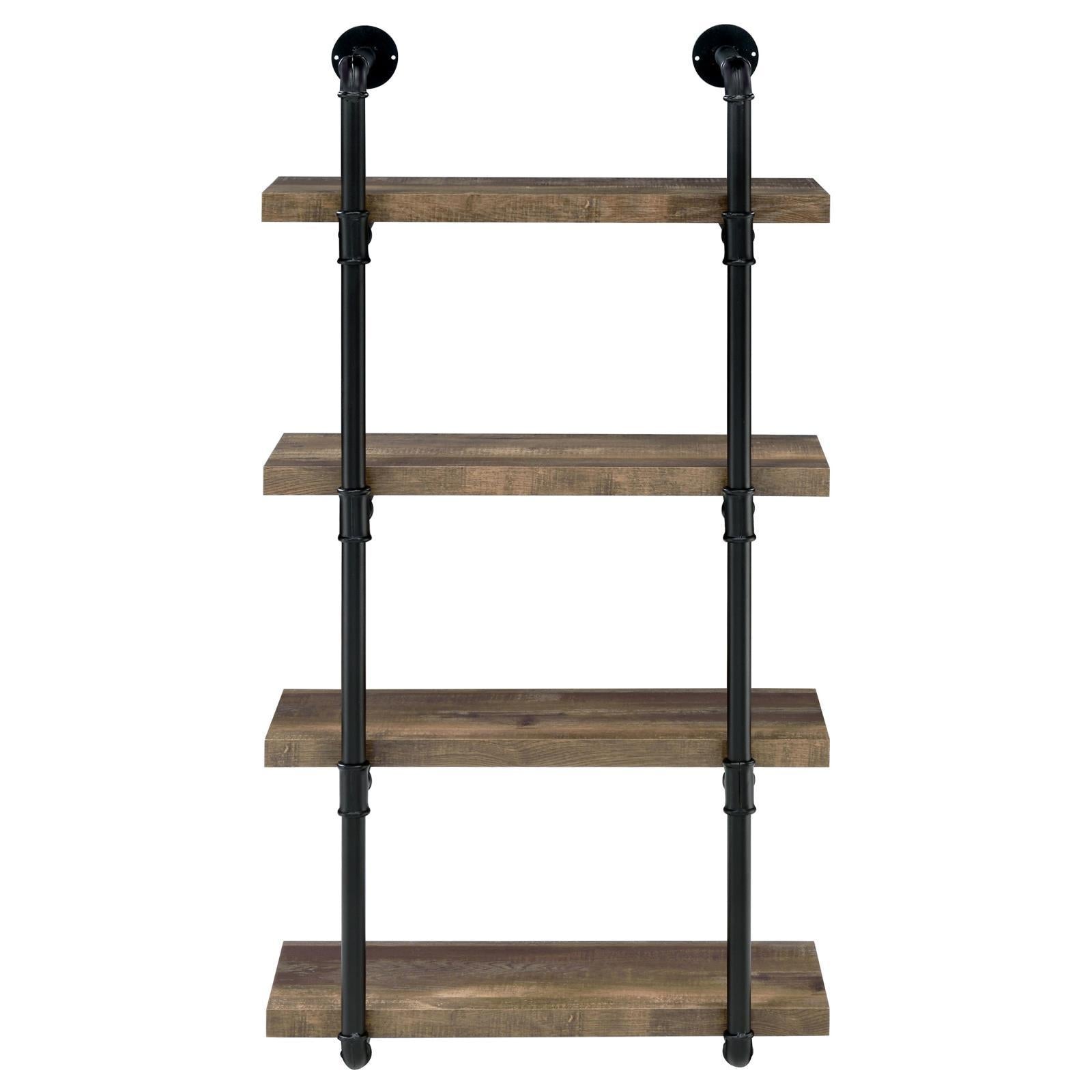 This industrial style wall-mounted shelf features planks supported by a pipe-like metal frame. Hang this shelf on a lakeside cabin living room wall to display family photos or book collections.