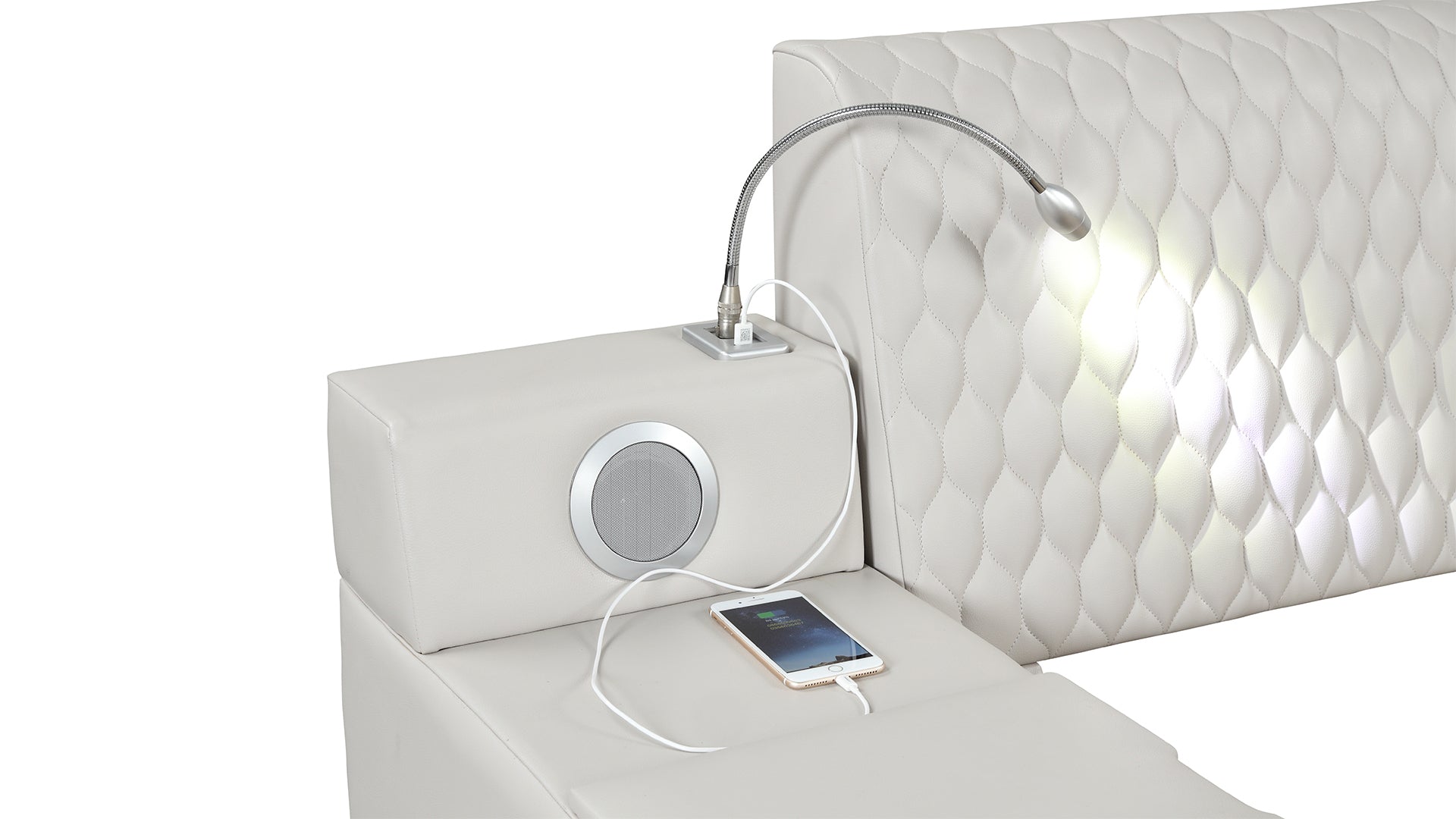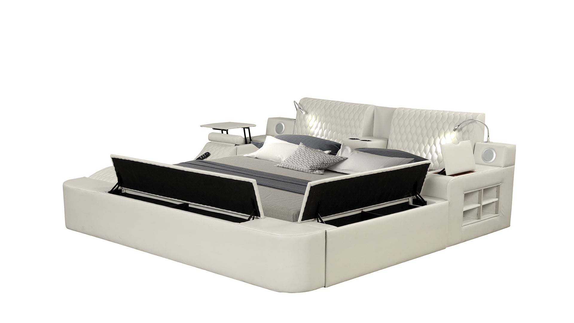 The Zoya Bed is the ultimate enclosure system, offering everything you need in one ultra-urban design, perfect for transforming your bedroom. This futuristic bed is equipped with a remote-controlled massage chaise lounge, built-in Bluetooth speakers, dual reading lights, and convenient storage solutions. The integrated charging station with USB hookups ensures you never have to leave the bed. The cushioned headboard and durable engineered wood frame provide maximum comfort and longevity. Available in Beige, Gray, Black, and Brown, and in King and Queen sizes, the Zoya Bed is a revolutionary, all-in-one solution for modern living.