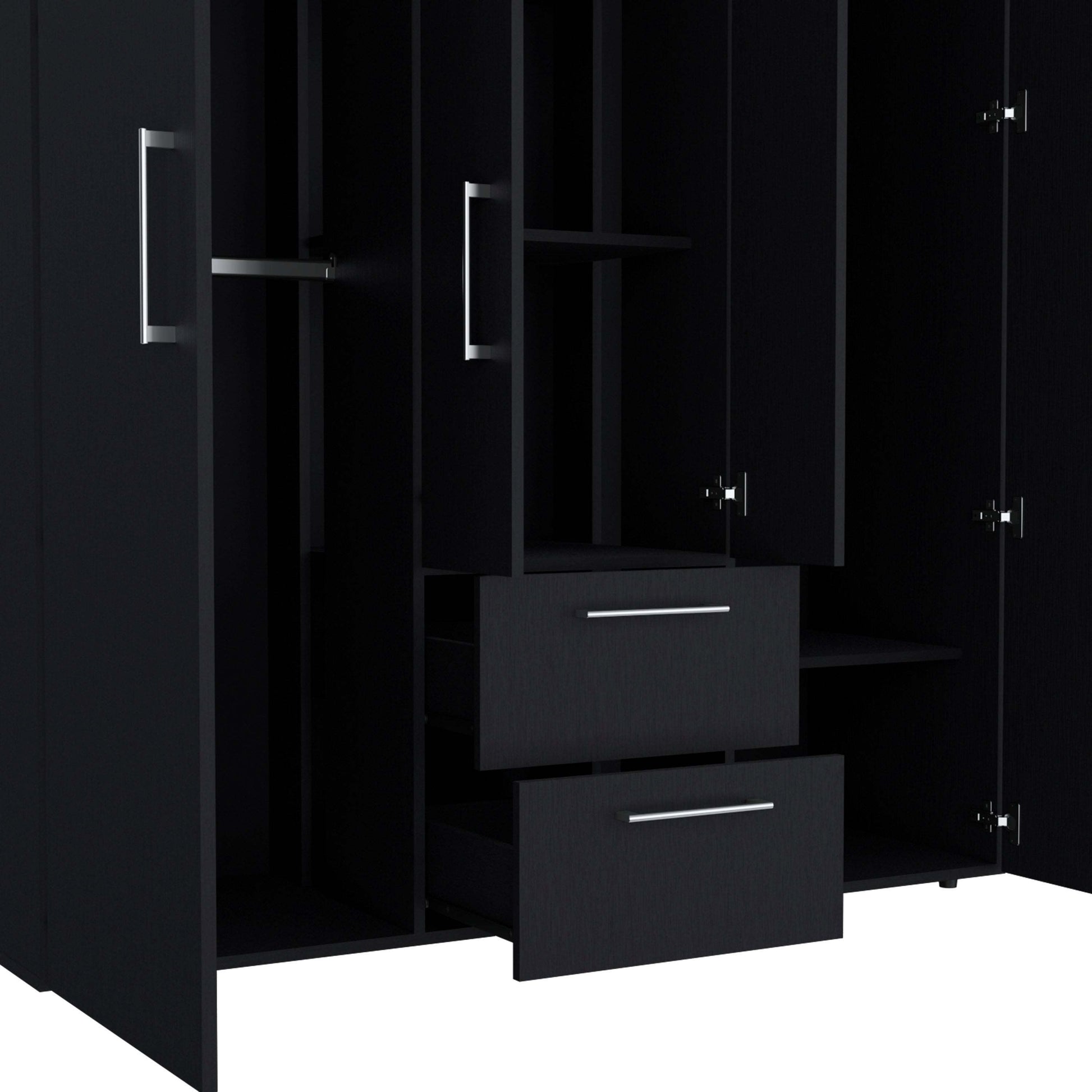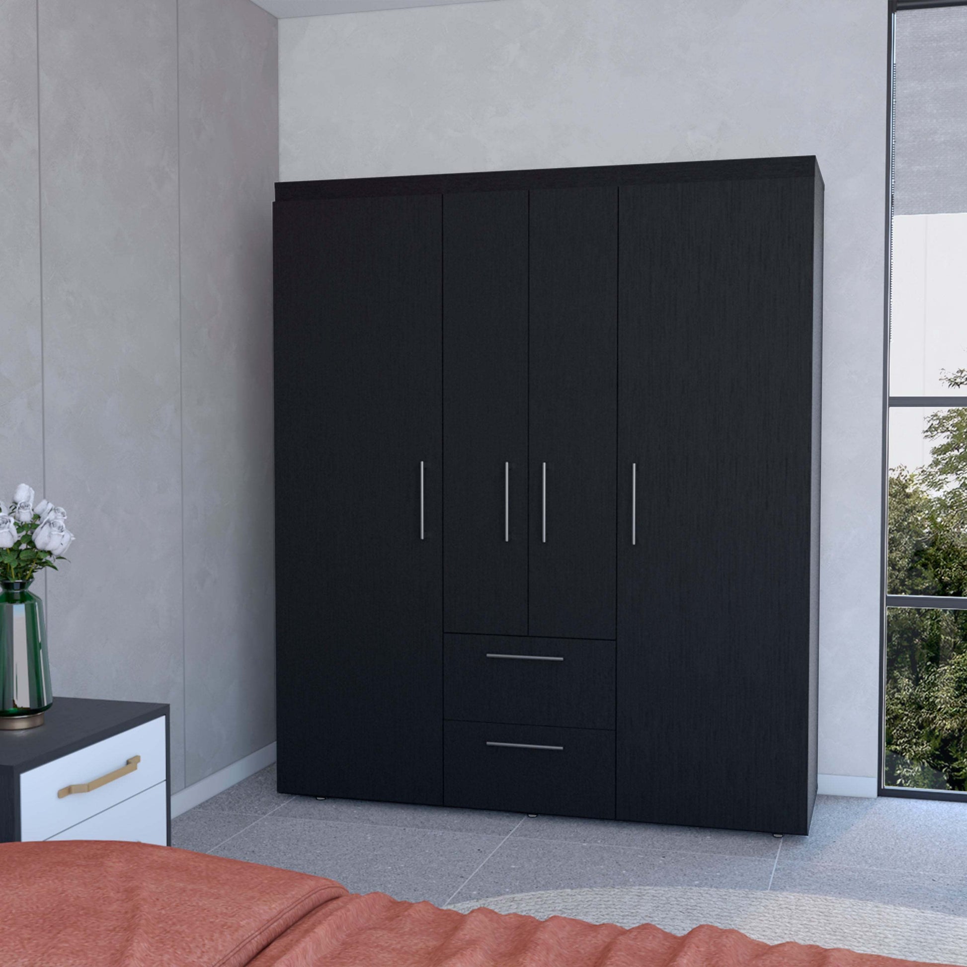 Presenting the refined wardrobe, where style seamlessly integrates with functionality. Featuring graceful side doors for hanging attire and a generous double-door compartment with shelving, paired with two drawers for accessories, it's the perfect fusion of fashion and practical design.
