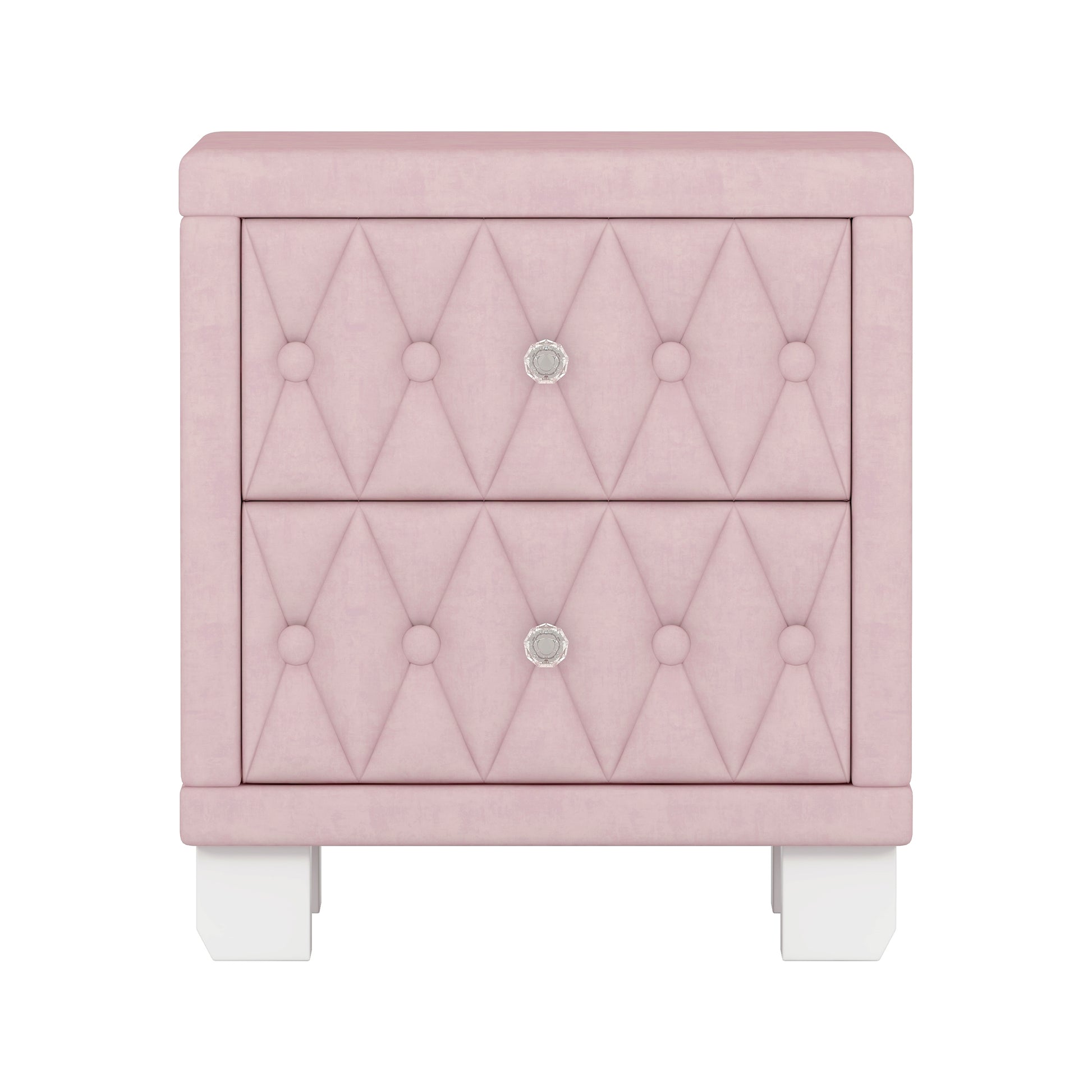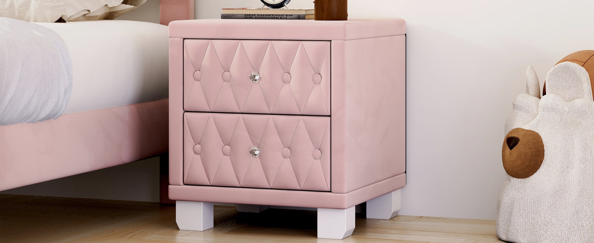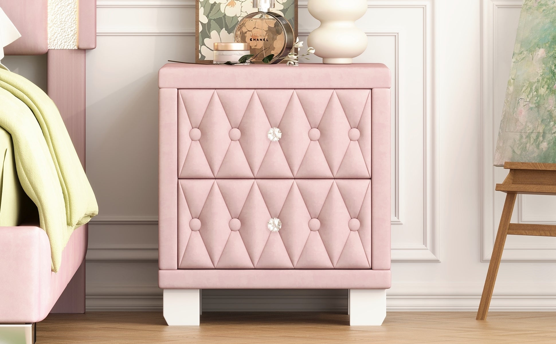 Elegant Velvet Nightstand with 2 Drawers and Crystal Handle, Storage Bedside Table with Button-Tufted, Pink