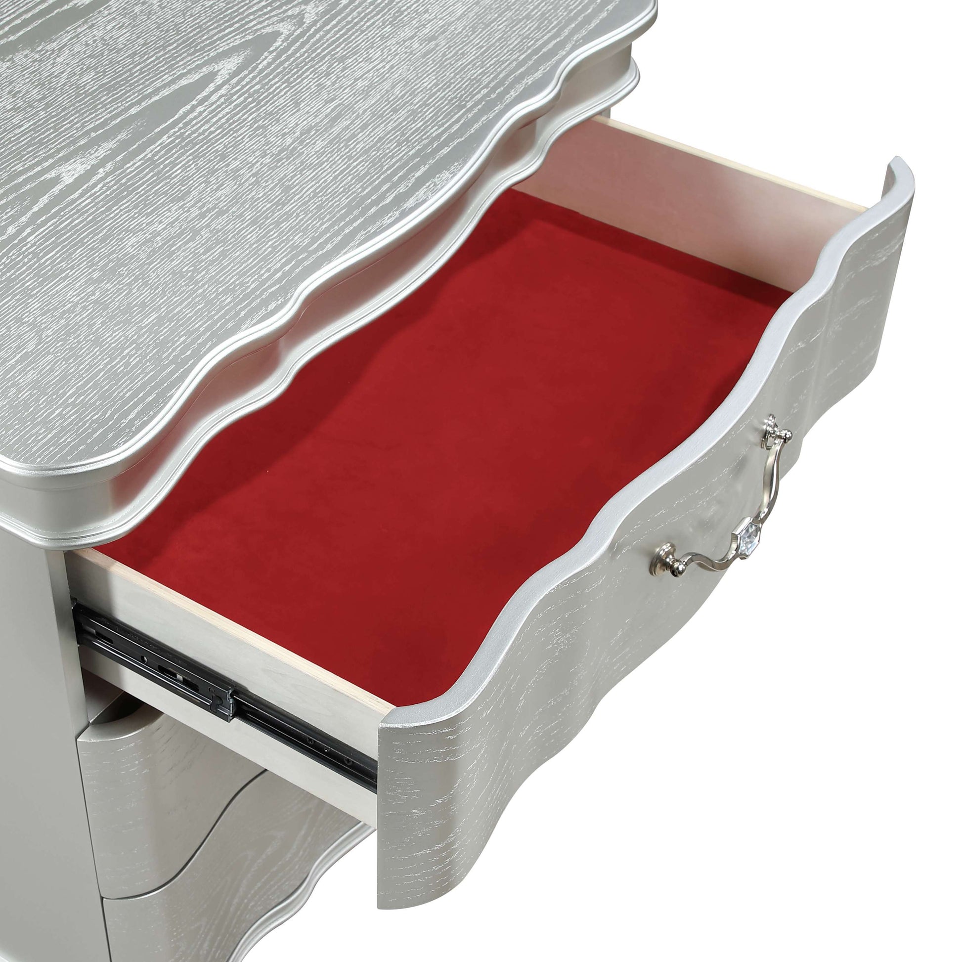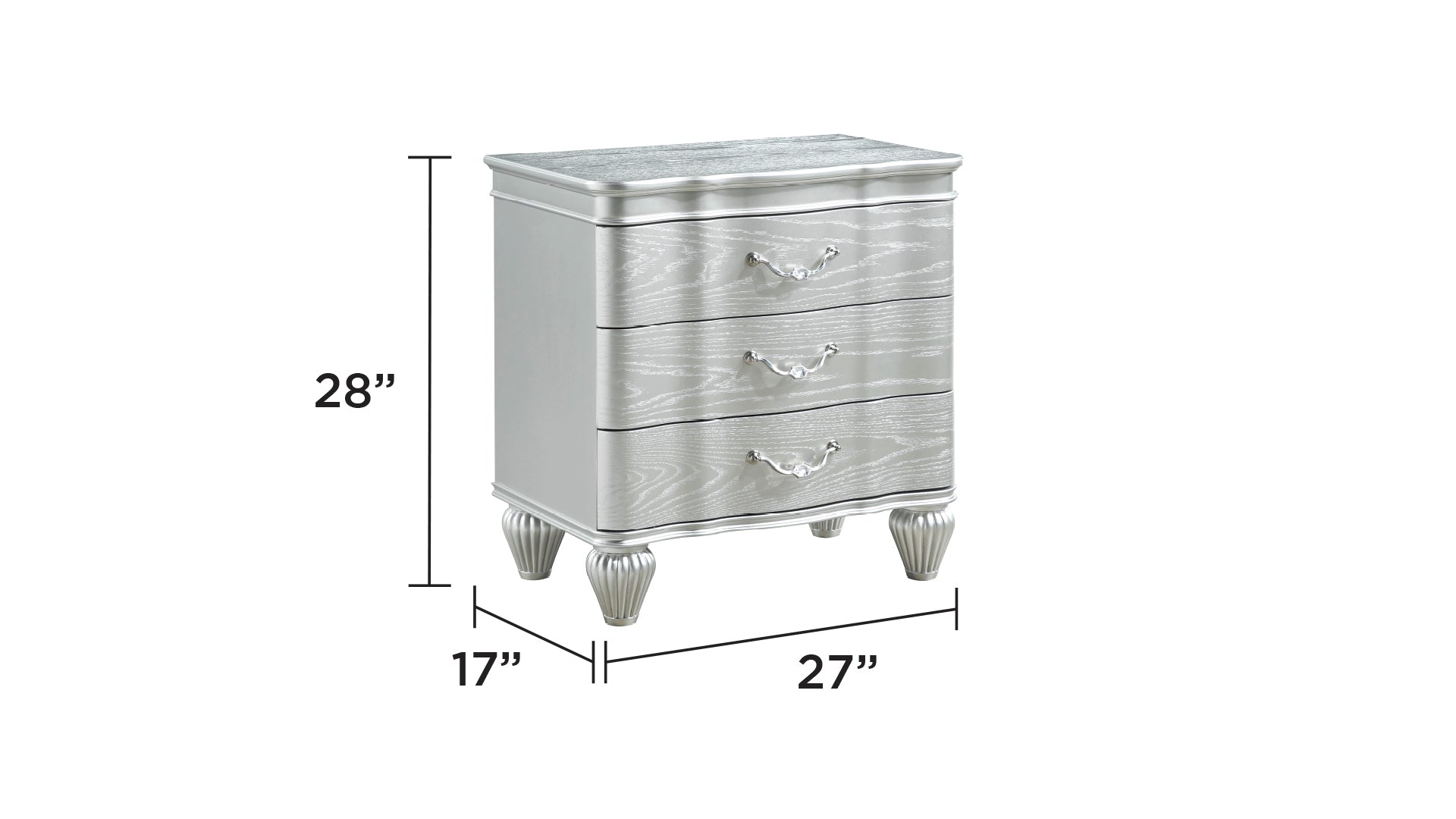Enhance your bedroom with this sophisticated nightstand, designed to offer both style and convenience. The nightstand features a sleek, silver finish that adds a touch of modern elegance to any bedroom decor. Its compact design includes three spacious drawers with decorative handles, providing ample storage for bedside essentials like books, glasses, or electronics.