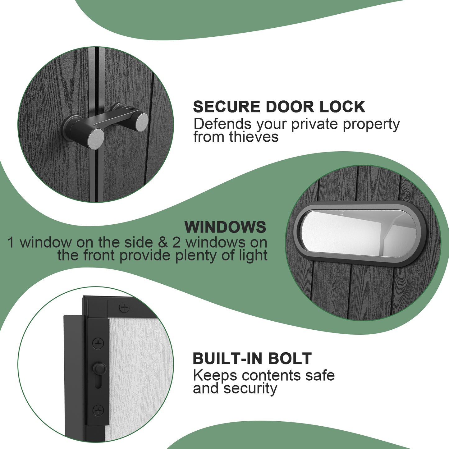 - Ventilation & Light: Built-in vents reduce moisture, while skylights and windows brighten the shed interior.