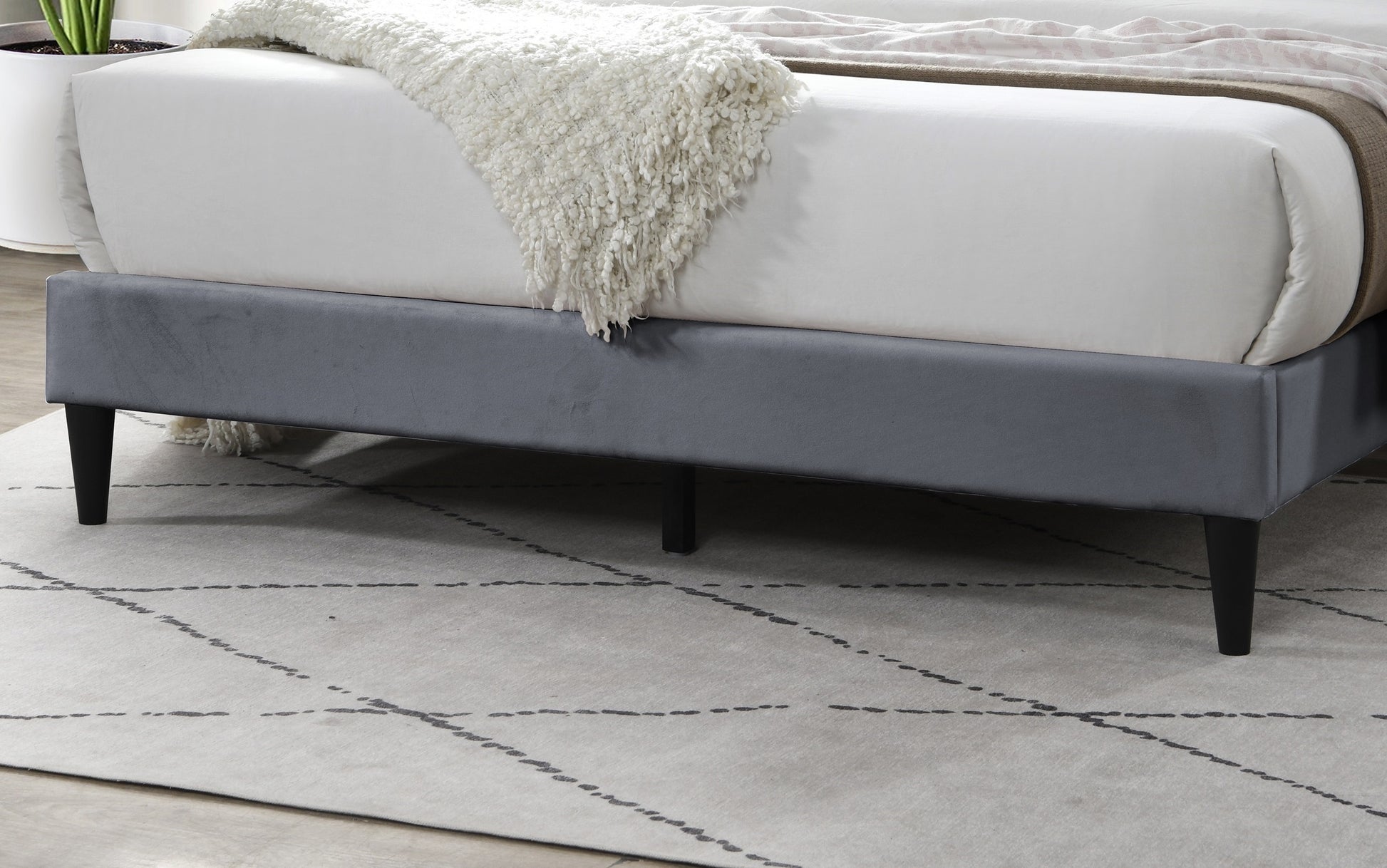This bed combines style and functionality to create the perfect centerpiece for any Modern space. With its thoughtful construction and attention to detail, this Queen bed offers both comfort and style. It's an ideal choice for those looking to enhance their bedroom with a modern and practical piece of furniture. Designed with support legs and a robust platform base, this bed provides excellent stability without the need for a box spring. The footboard ensures a streamlined look, completing the bed's clean design. The headboard features a distinctive geometric stitched design, offering a modern flair that complements any decor. This unique design element adds visual interest and a touch of artistry to your bedroom. Available in neutral colors, the velvet upholstery brings a touch of softness and sophistication to your bedroom. The plush material adds a cozy feel, making it an inviting spot to relax and unwind.