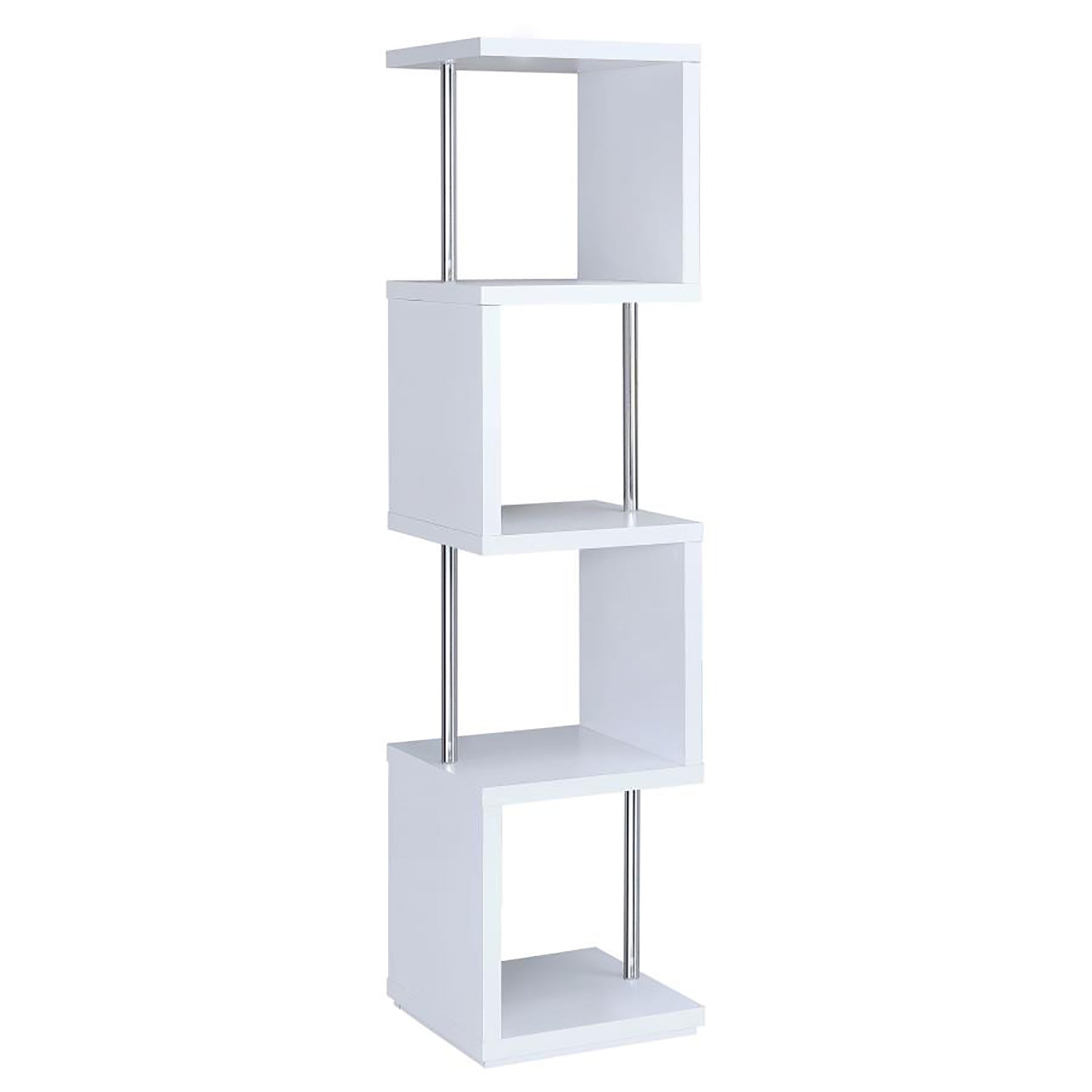 The sinuous, snaking shape of this four-tier, stacked bookcase is a design focal point, harmonizing with the crisp white and black finish and chrome metal bar accents. The resulting four shelves have the capacity to attractively showcase your featured items like books and art objects.