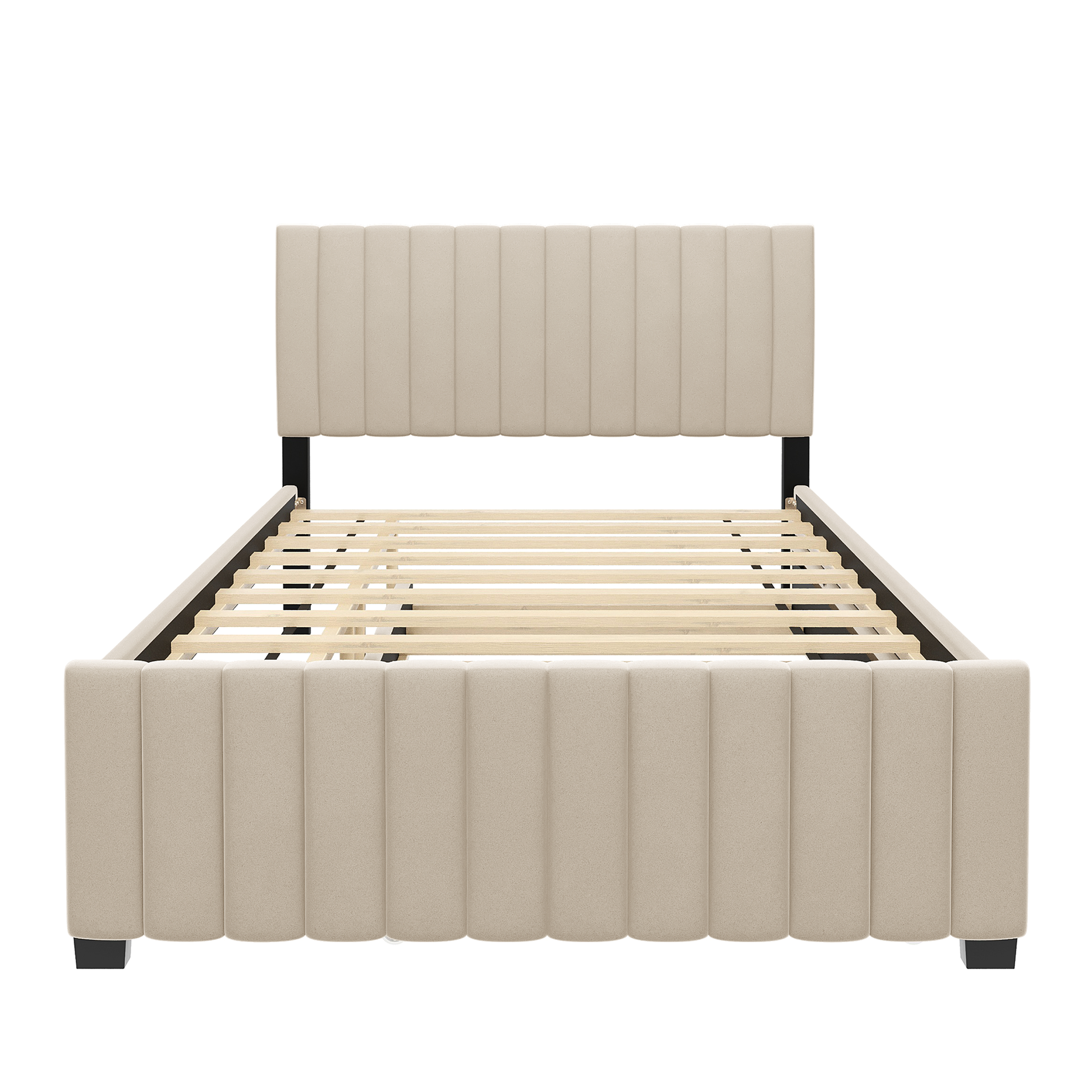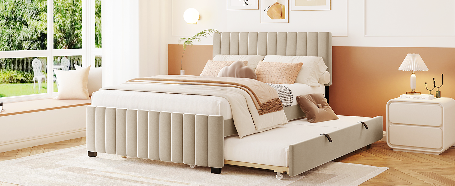 Full Size Velvet Upholstered Platform Bed with Twin Size Trundle, Beige