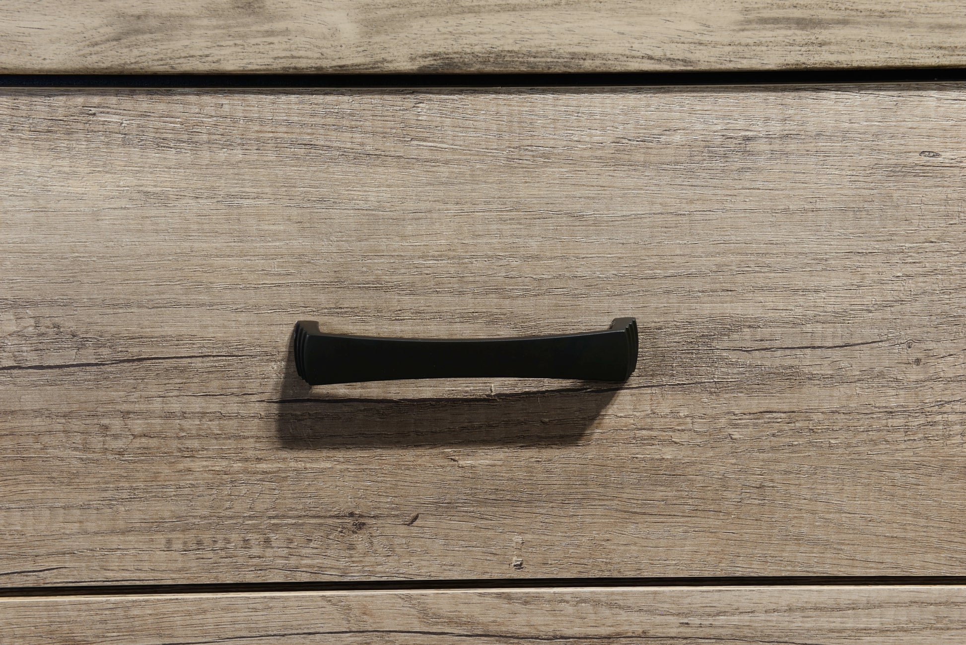The sleek tall nightstand has a light grey finish, a clean frame, and flat drawer panels. Black metal bar hardware on the two drawers matches the accents on the top corners of the frame. Pair with the bed in this collection for a stylishly refined bedroom set.