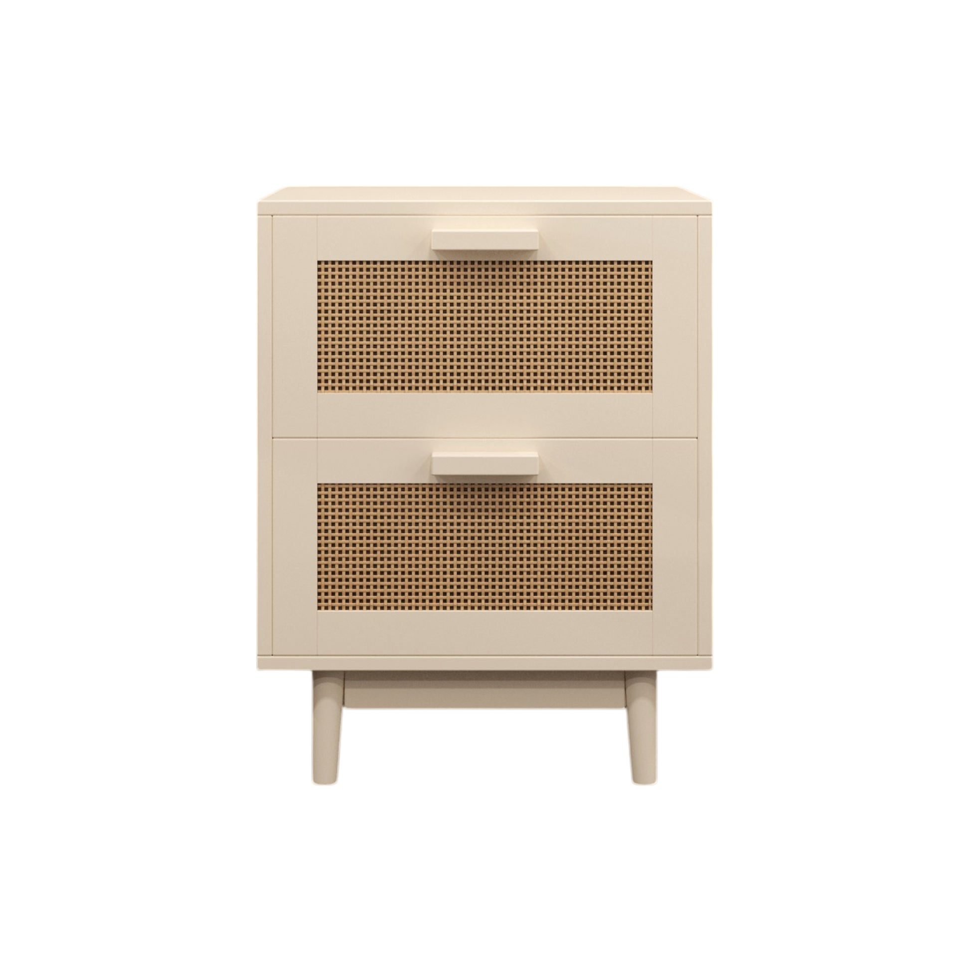 - Featuring expertly crafted rattan-style sliding drawers and a natural wood-tone finish, this bedside table combines functionality with aesthetic appeal. Though the rattan is synthetic, it mimics the texture and charm of natural materials, ensuring durability and easy maintenance. This versatile piece functions as a nightstand, bedside cabinet, or storage unit, meeting various bedroom storage needs. With clean lines and a timeless design, it complements a range of interior styles, adding understa