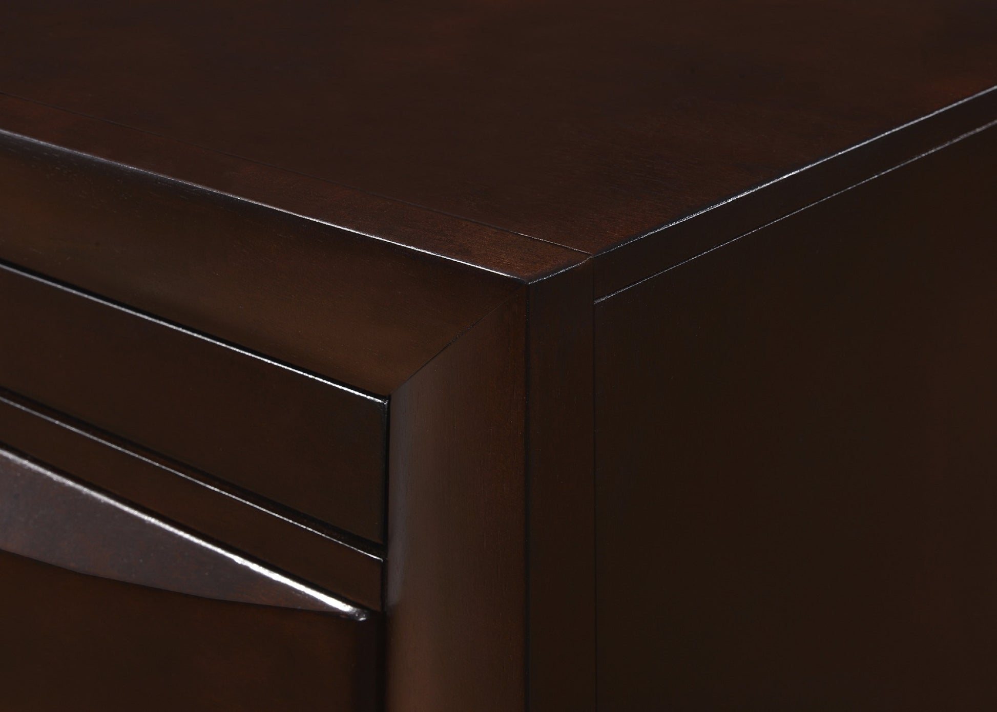 A sleek silhouette is wrapped in a rich finish that blends seamlessly with the exposed wood on the bed. Bold beveled drawer fronts dress up the front of the nightstand and are crowned with silver finish knobs for a sophisticated modern look. Top with a lamp, frames and decorative accents for a beautiful and functional addition to your contemporary bedroom suite.