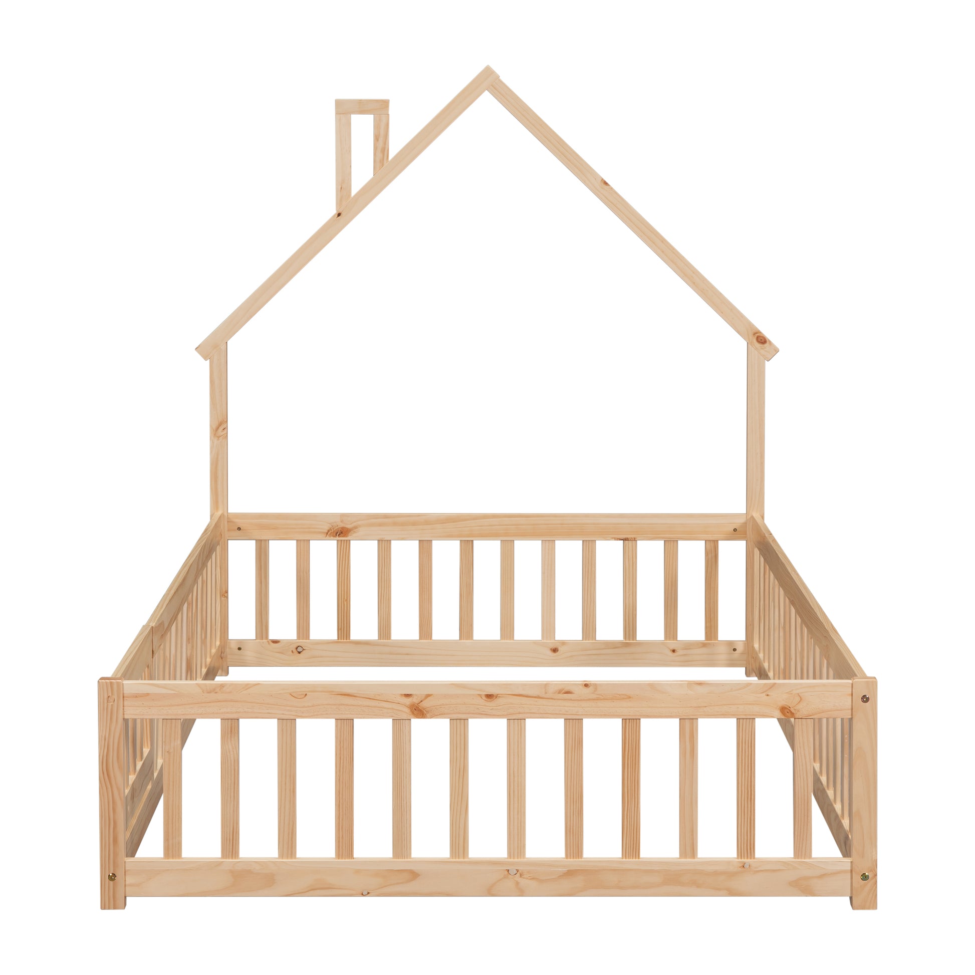 Full House-Shaped Headboard Floor Bed with Fence,Natural