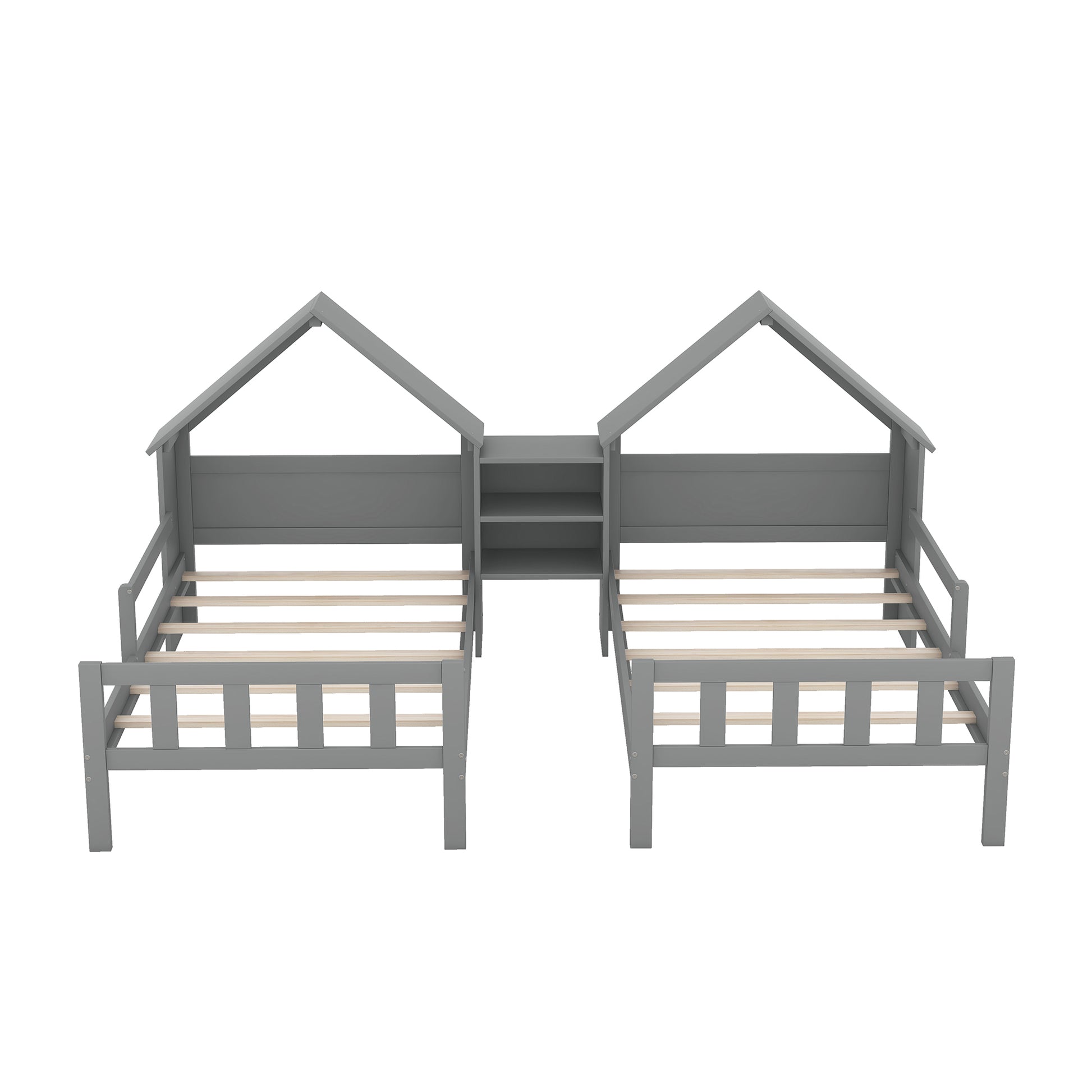 Double Twin Size Platform Bed with House-shaped Headboard and a Built-in Nightstand, Grey