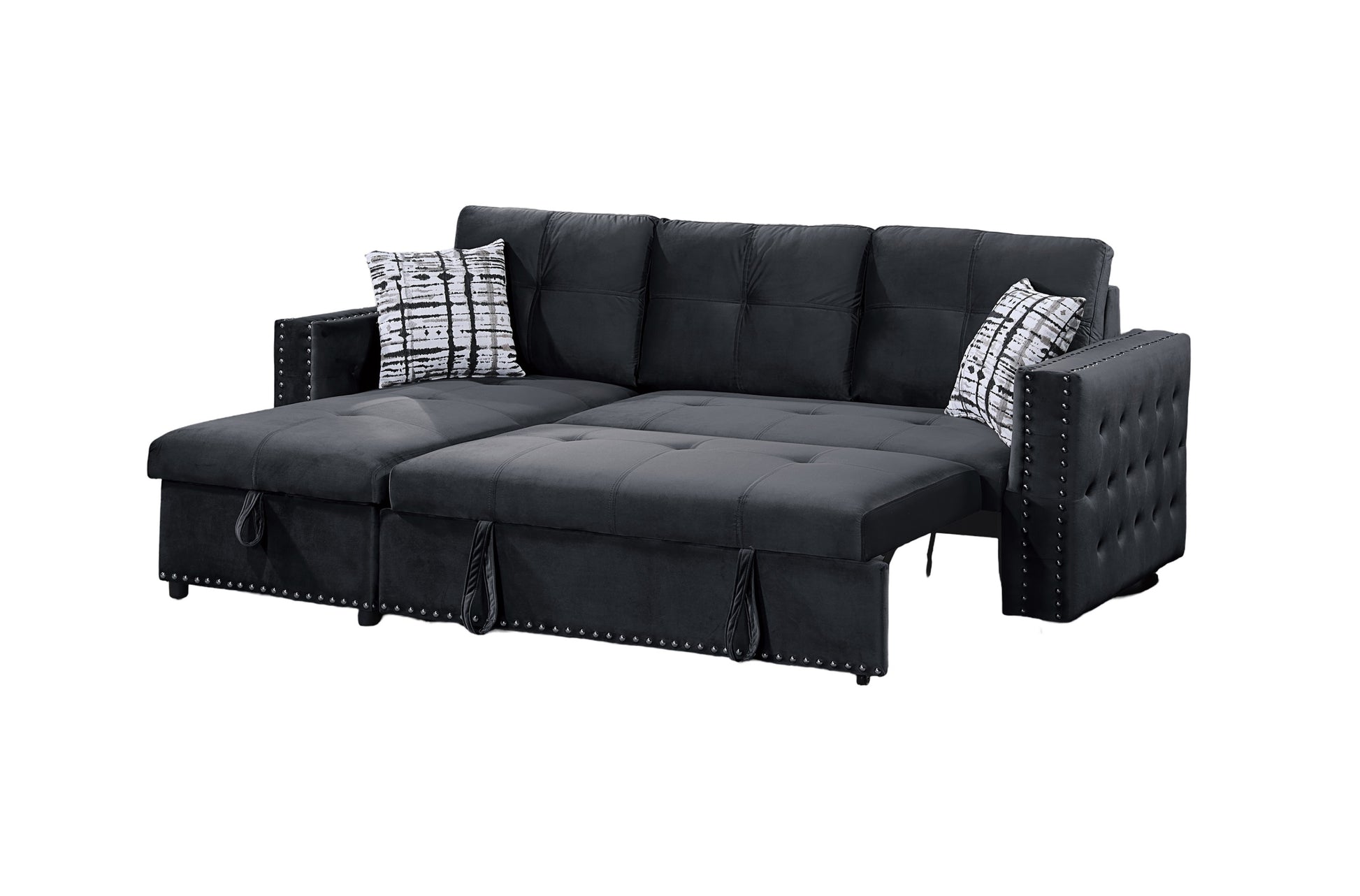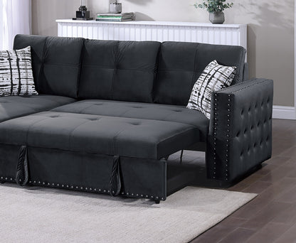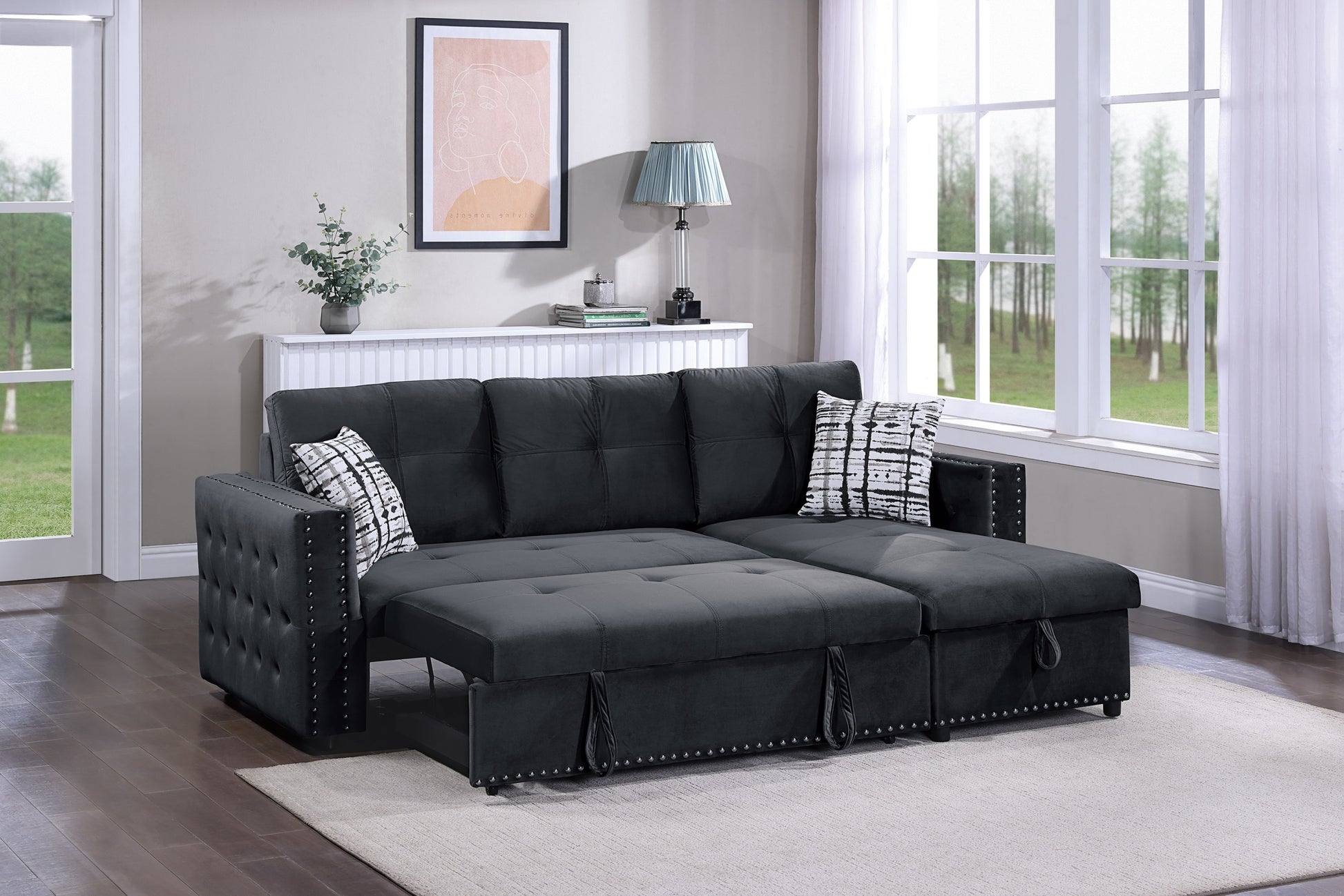 Black Velvet Convertible Sectional Sofa Pull out Bed Couch Storage Chaise Tufted Reversible 2pc Sectional Living Room