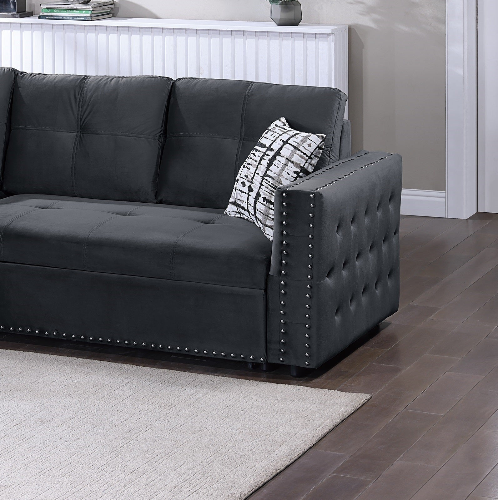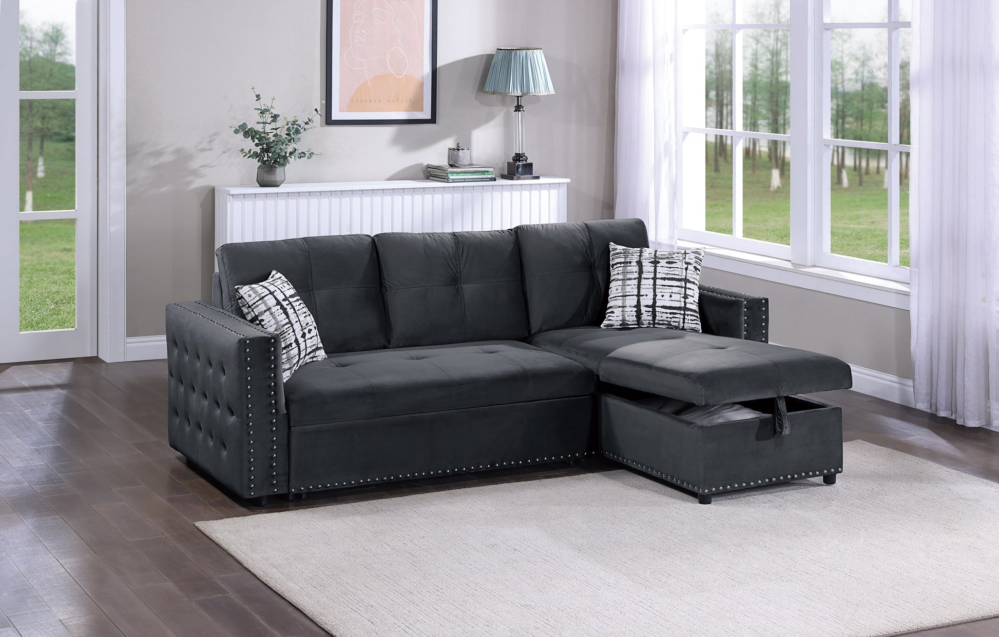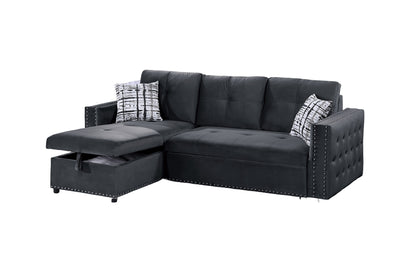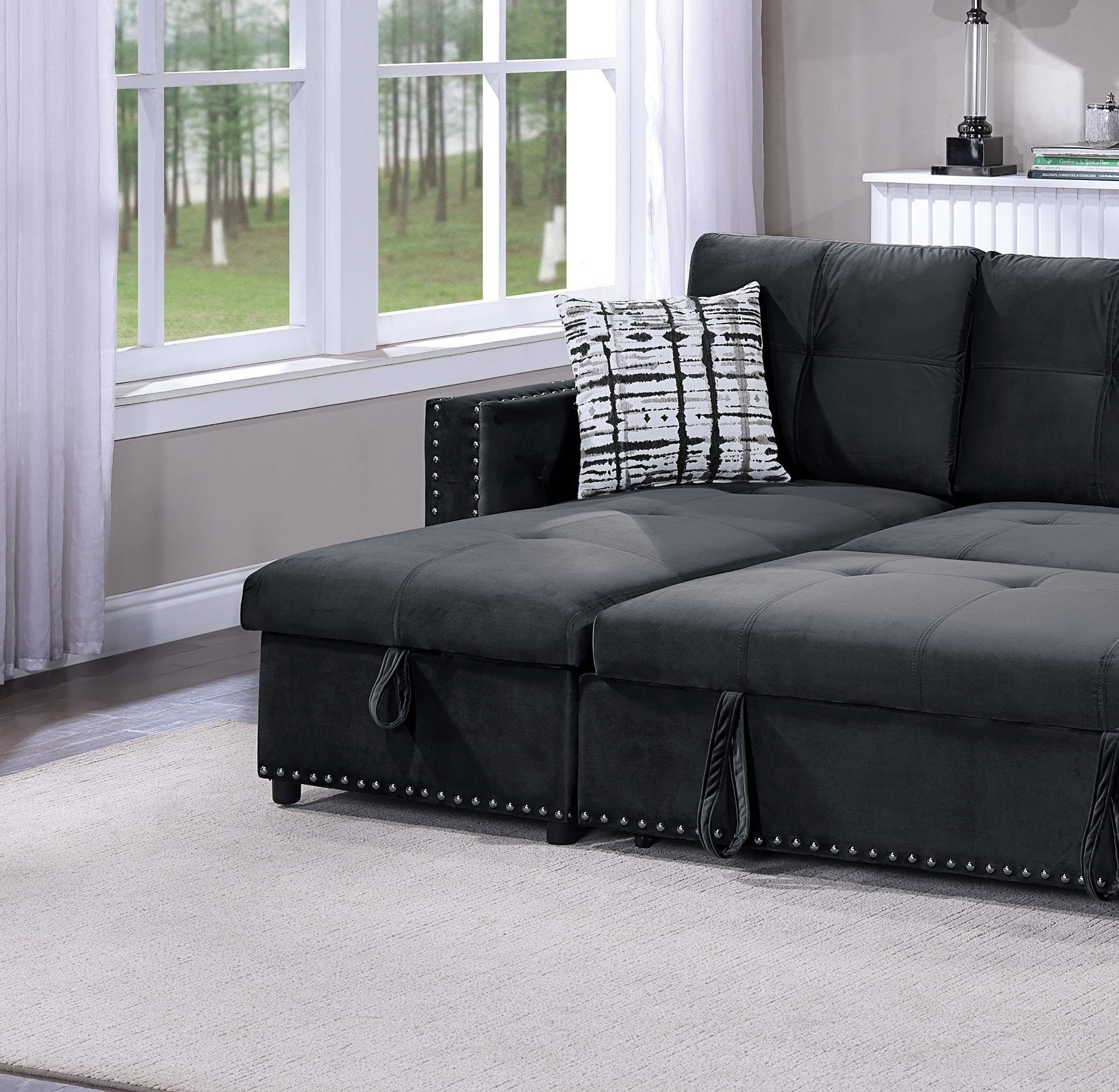 Black Velvet Convertible Sectional Sofa Pull out Bed Couch Storage Chaise Tufted Reversible 2pc Sectional Living Room