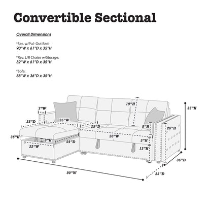Listing Include : 2pcs Reversible Sectional Sofa Set Only.(Sofa w/Pull Out Bed And Chaise w/Storage).