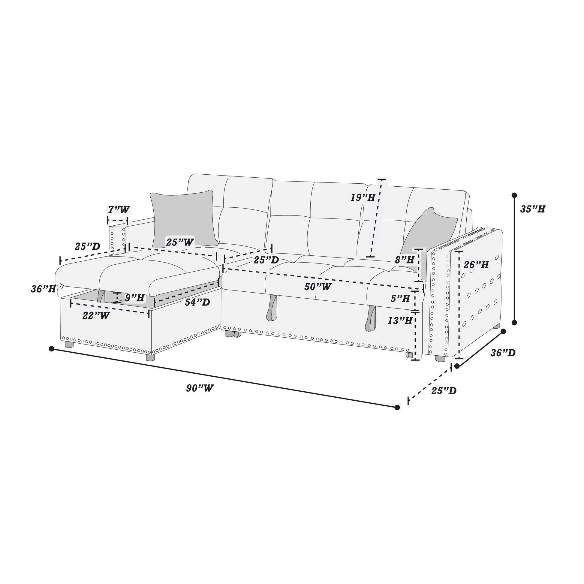This exceptional piece seamlessly combines comfort, functionality, and contemporary design to elevate your living space. Choose the configuration that suits your space and preferences with the reversible chaise. The reversible chaise is not just a comfortable lounging spot – it also features convenient storage underneath. Keep your living space organized and clutter-free with this hidden storage compartment, perfect for blankets, pillows, or any other essentials. Enjoy the luxury of tufted seats and back cushions that not only provide plush comfort but also add a touch of sophistication to your decor. The square arms are adorned with nail head trim, adding a touch of elegance to the overall design. Diamond button tufting on the side further enhances the aesthetic appeal. To complete the look, we've included two accent pillows with captivating designs. These pillows add a pop of color and personality to your sectional, creating a cohesive and stylish living space.