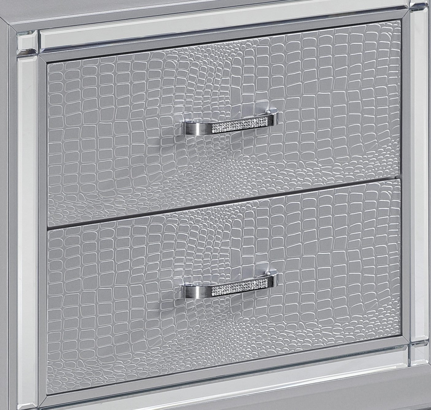 Framing nightstand is a decorative beveled mirror accent that enhances the illumination from the touch-engaged LED under-light of the nightstand. The alligator embossing of the drawer fronts is paired with high-polished crystal-enhanced hardware that boldly decorates the silver finish.