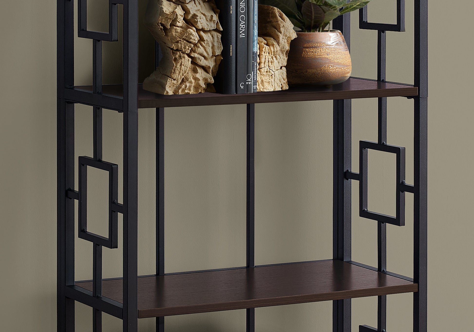 - 4 tier metal etagere bookshelf with large evenly-spaced storage shelves finished in dark brown