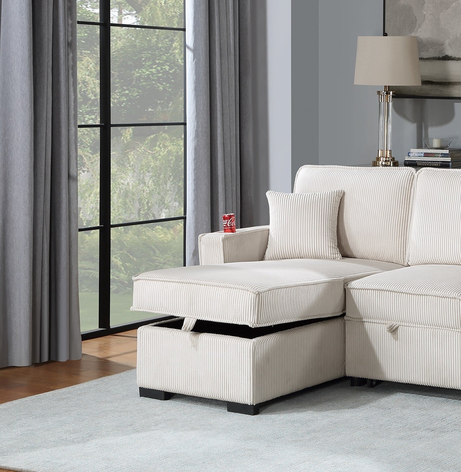 Convertible Sectional Beige Color Corduroy Reversible Chaise w Storage And Sofa Pull Out Bed Pillows Living Room 2pc Set