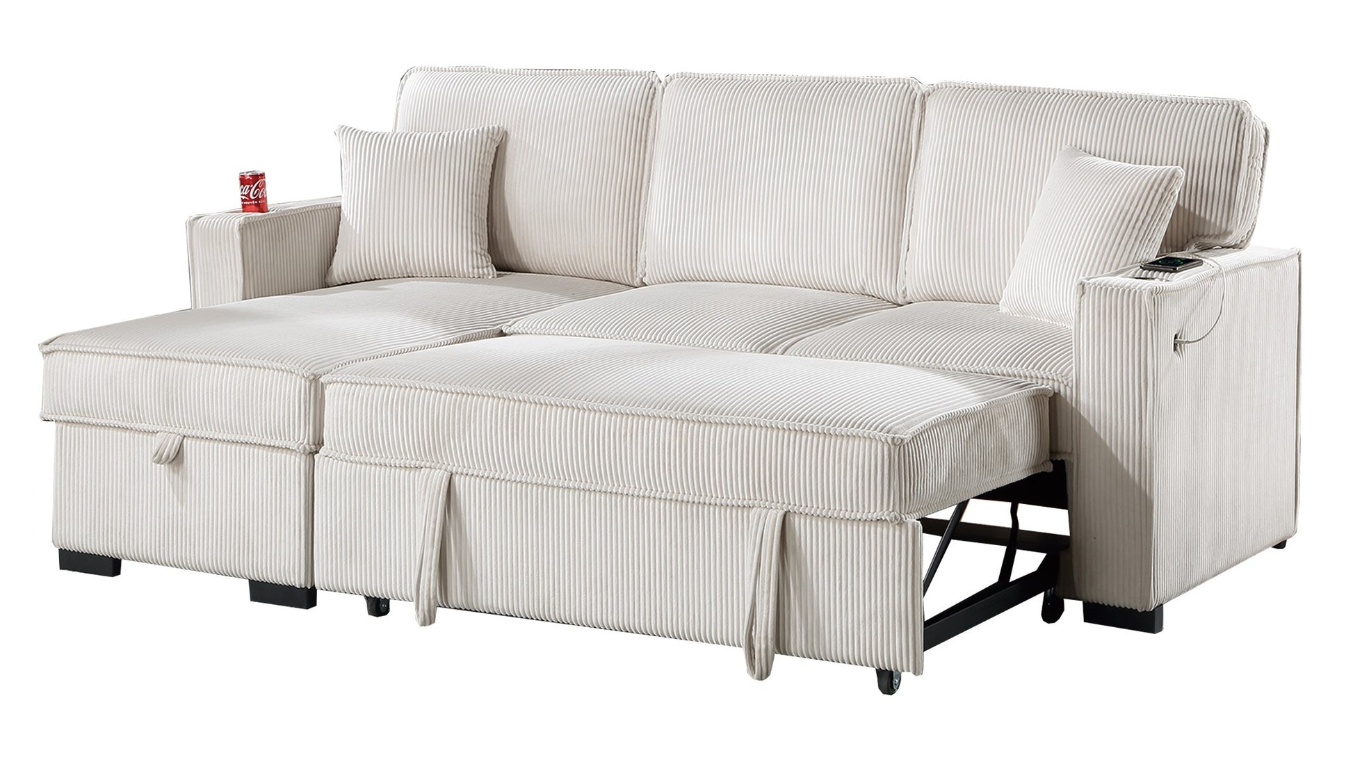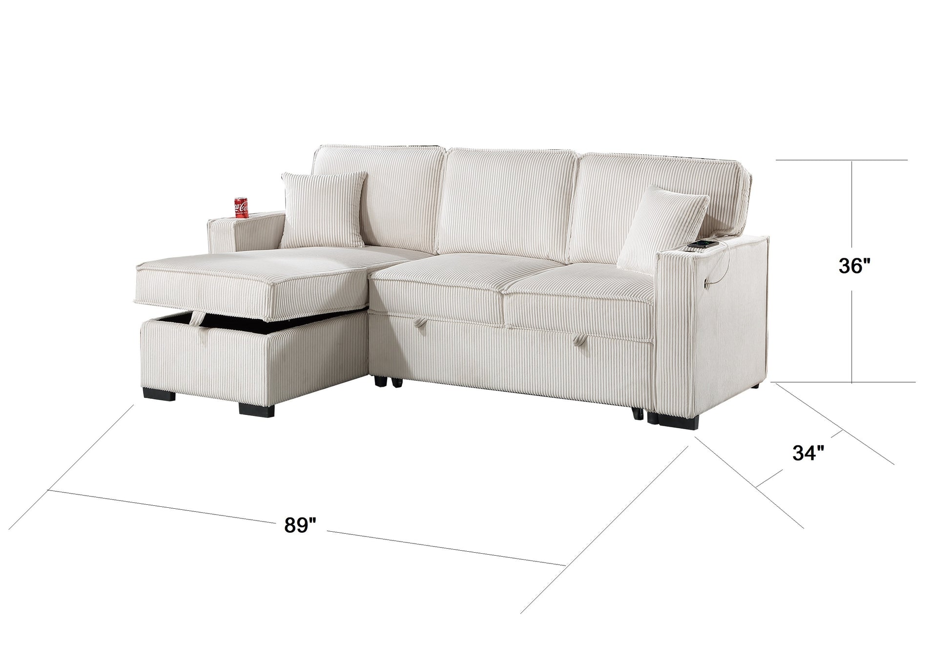 Enjoy the convenience of a multi-functional piece that adapts to your needs. Featuring a Reversible Chaise Lounge conveniently reverses to fit perfectly into any living room configuration. The Chaise also includes a hidden storage compartment within the chaise – ideal for tucking away throws, pillows, or anything else you need to keep out of sight! But that’s not all! The chaise also features a hidden cup holder to keep your drinks close at hand. The sofa boasts a built-in USB port to keep your devices powered up. Whether you're binge-watching your favorite shows or catching up on work, stay powered up and relaxed simultaneously. The sofa's pull-out extension effortlessly converts into a bed, providing an extra sleeping space for guests or a cozy spot for movie nights. With two handles conveniently located in the front, transforming your sofa into a bed has never been easier. Upholstered in luxurious corduroy fabric, this sectional offers both style and comfort. The low-profile legs add a modern touch, while the two included throw pillows complete the look.