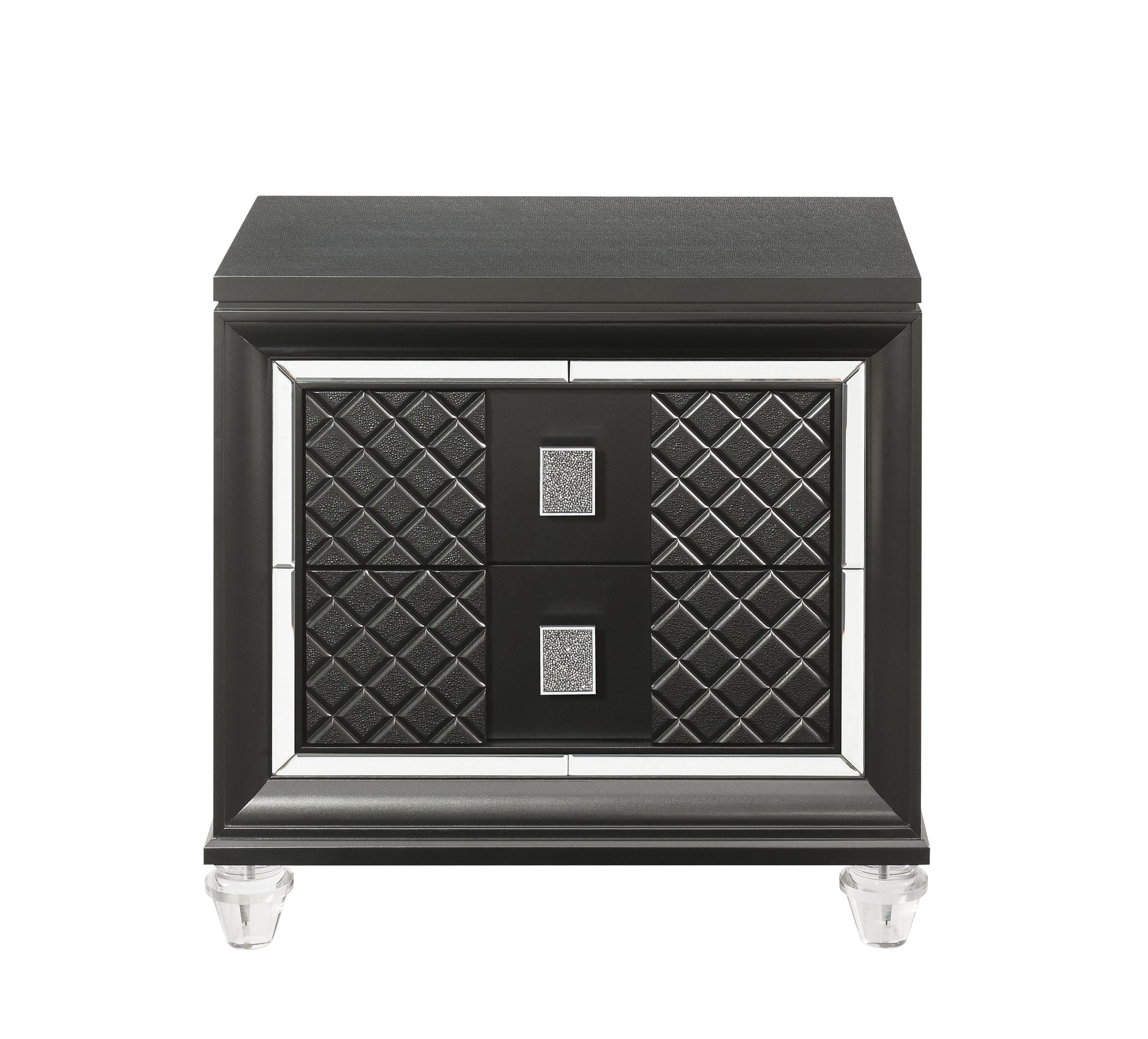 - This glamorous nightstand features two spacious drawers, each adorned with sparkling trim and embossed fronts for a touch of luxury and intricate design.