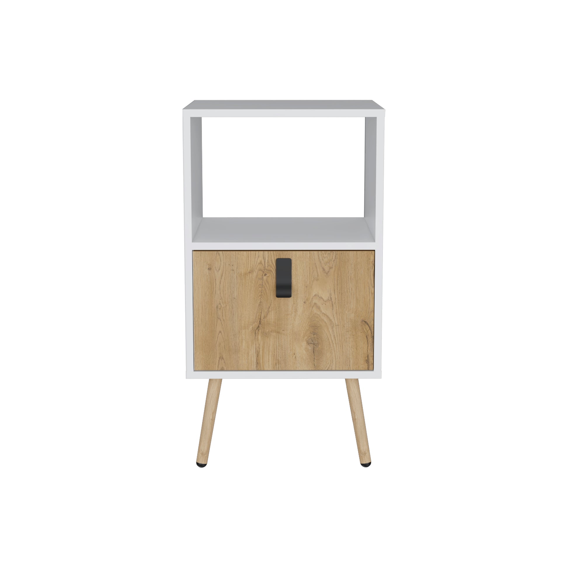 "Revamp your bedside with the sleek Kimball Tall Nightstand, blending a white/macadamia palette into a modern design. This compact yet spacious nightstand features an open slot (14.5""W x 9.9""H) and a deep drawer (13.2""W x 4.9""H) supported by elegant wooden legs. Ideal for keeping essentials within reach and showcasing your favorite décor, it's a chic, space-savvy addition to any bedroom.