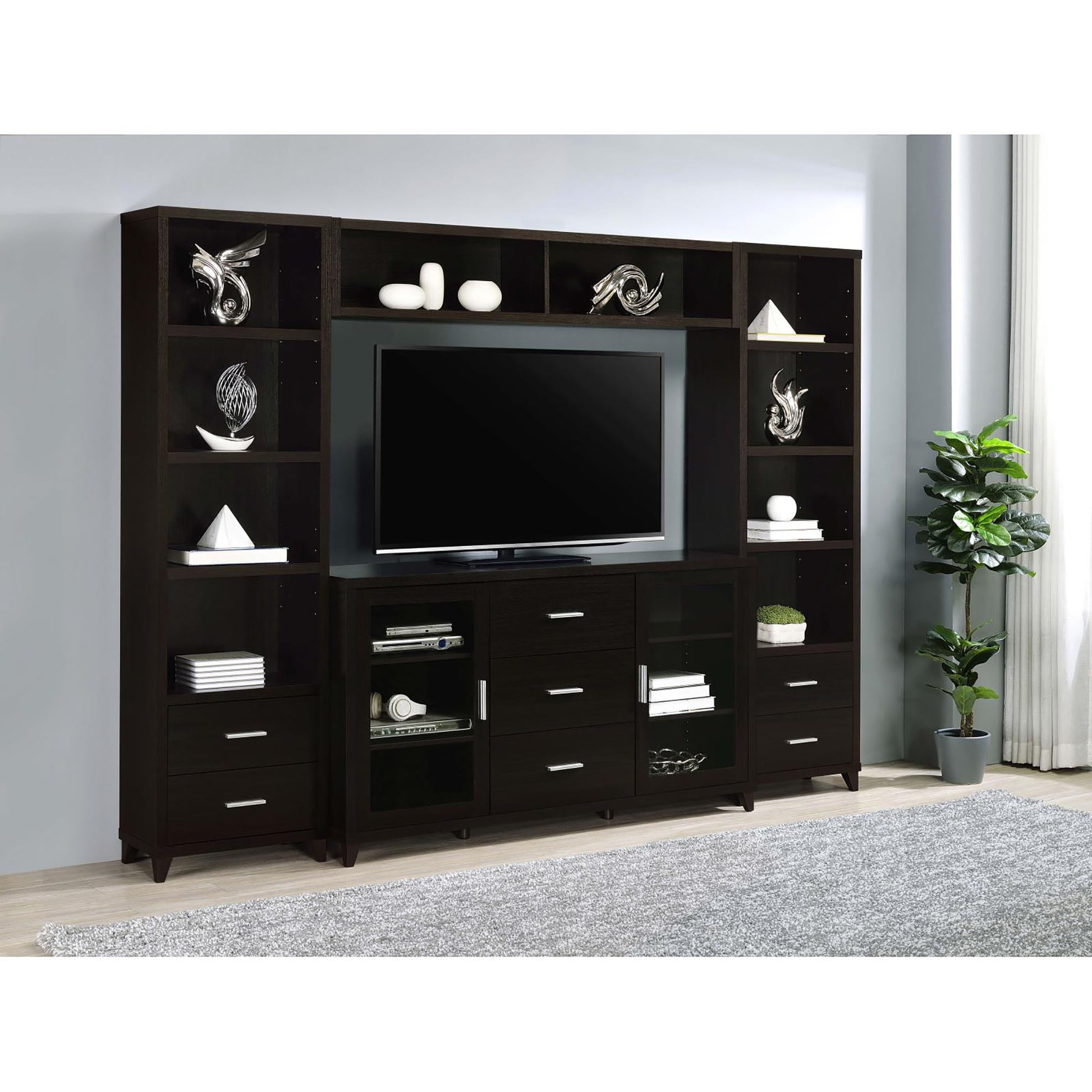 Set this contemporary media tower in a cappuccino finish in an entertainment room to display music albums and book collections. With four spacious open shelves and two bottom drawers with a long silver handle, this media tower works nicely set beside a TV console or own its own along a focal wall.